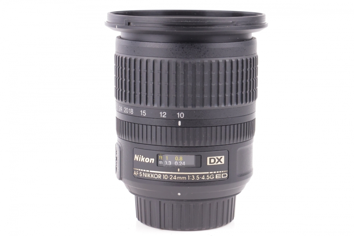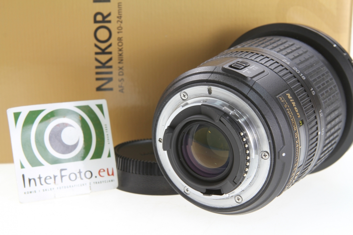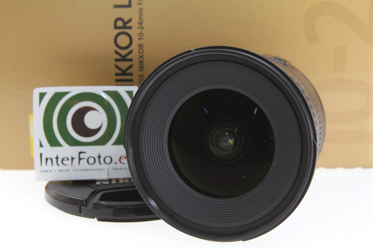 Gwarancja: 3Nikkor 10-24/3.5-4.5 ED AF-S DX to ultraszerokokątny obiektyw o zmiennej ogniskowej z zoomem 2,4x. Jego parametry techniczne to: ogniskowa 10-24, (odpowiednik w formacie 35mm:15-36mm) f/3,5-4,5, i kąt widzenia po przekątnej wynoszącym od 109° do 61°. Układ optyczny zawiera dwa elementy ze szkła ED i soczewki asferyczne. Obiektyw yposażony jest w silnik SWM.