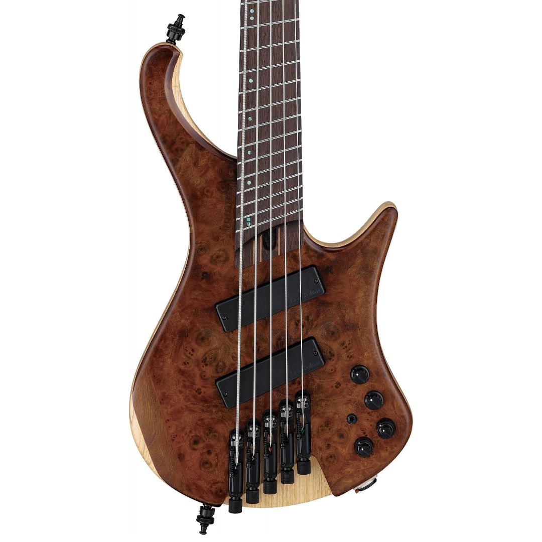 Model EHB1265MS-NML wyposażony jest w wysokiej jakości osprzęt, który gwarantuje stabilność stroju i niezawodność podczas intensywnego użytkowania. Most MR5HS z rozstawem strun 18 mm zapewnia precyzyjną intonację i komfort gry, a specjalne główki strun Ibanez umożliwiają łatwą wymianę strun bez konieczności używania dodatkowych narzędzi. Gitara posiada również piny do blokady paska Schaller S-Locks, które zapobiegają przypadkowemu odpięciu się instrumentu podczas występu. Czarny kolor osprzętu doskonale komponuje się z naturalnym wykończeniem korpusu w odcieniu Natural Mocha Low Gloss, nadając gitarze elegancki i profesjonalny wygląd. Dodatkowym atutem jest zdejmowana rampa pod palce, która ułatwia technikę gry, szczególnie w przypadku stylu tapping czy slap.