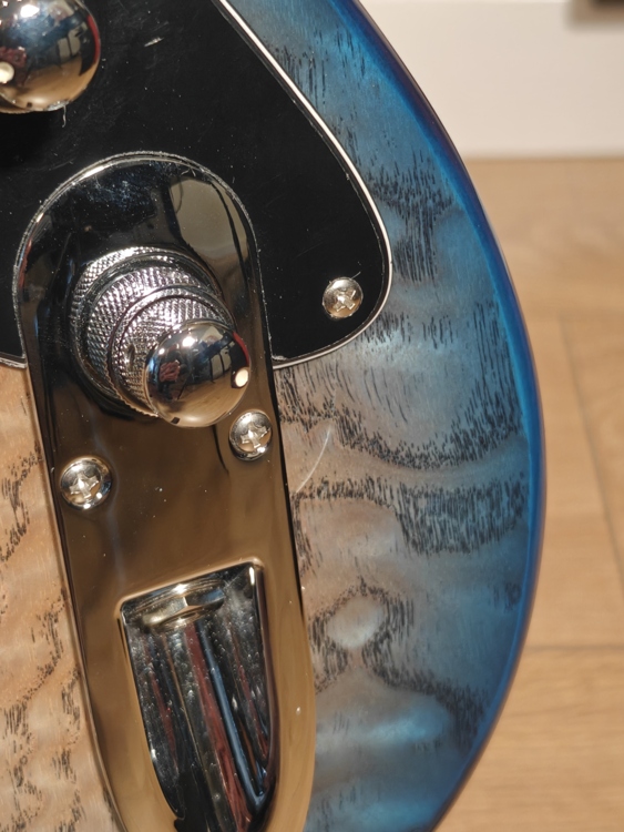 Gitara używana, w bardzo dobrym stanie, z wyjątkiem niewielkiego pęknięcia lakieru w okolicy płytki z gniazdem jack, widocznego na jednym ze zdjęć.