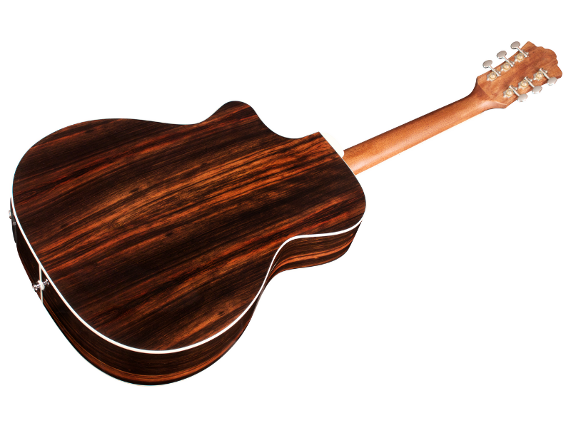 Dodaj trochę egzotycznego blasku do swojego akustyka dzięki OM-260CE Deluxe! Ta gitara w rozmiarze Orchestra posiada lity świerkowy top z oszałamiającym, łukowatym, pasiastym hebanowym tyłem i pasiastymi hebanowymi bokami. To unikalne drewno nadaje OM-260CE czysty, mocny głos z wyraźną odpowiedzią basową, a błyszczące wykończenie podkreśla unikalny wzór pasków. Góra OM-260CE Deluxe posiada wykończenie w kolorze antique burst, uzupełnione ciemnymi, głębokimi brązami pasków hebanu z tyłu i po bokach. Wyposażenie premium obejmuje rozetę z masy perłowej, logo Guild Peak na główce, podstrunnicę i mostek z pau ferro oraz przetwornik Fishman Sonitone z regulacją głośności i tonu.