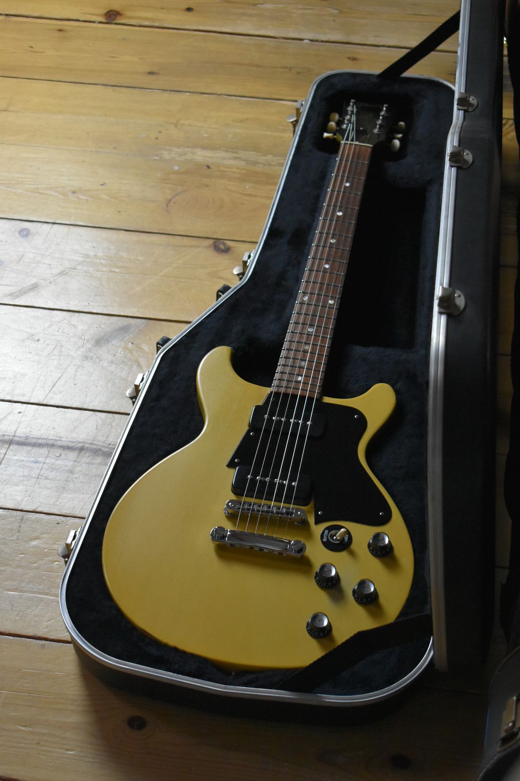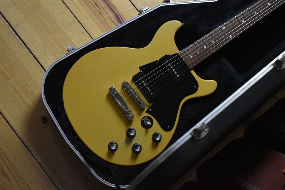 Dostępny jest wyjątkowy, w pełni oryginalny Gibson USA Les Paul Special Faded Double Cutaway z 2005 roku w pięknym, przetartym wykończeniu TV Yellow, w komplecie z twardym futerałem ABS, jak na zdjęciu.