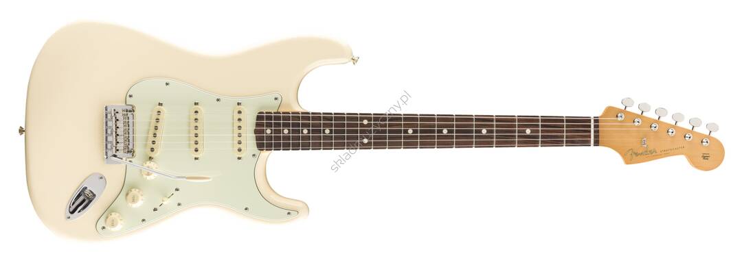 Aby sięgnąć po nowoczesne brzmienie i styl, firma Fender zastosowała klasycznie trzy single, ale podnosząc nieco poprzeczkę, zwiększyła ich moc wyjściową. Przetworniki grają grubo, a jednocześnie wyraziście, mają w sobie moc potrzebną do każdego stylu muzyki. Szyja w kształcie „Modern C” ma podstrunnicę z Pau Ferro o promieniu 9,5 cala z 21 progami Medium Jumbo. Nowoczesny, dwupunktowe zsynchronizowane tremolo zapewnia niezrównaną wydajność i stabilność strojenia, podczas gdy przełącznik S-1 dodaje przetwornik gryfowy do pozycji 1 i 2. No bomba. Cóż jeszcze można napisać o tej gitarze, .. gitarę ustawia się w stylu vintage, wyposażona jest w zaczepy na pasek, osprzęt i płytka mocująca gryf są chromowane. Kolor gitary to Olimpic White, czyli po polski taki postarzały biały. Pickguard w kolorze delikatnej mięty. Piękna gitara, piękny strat.
