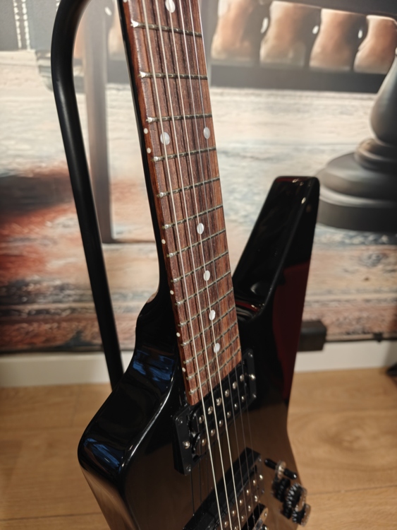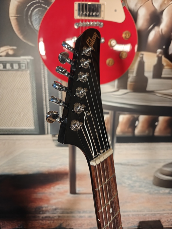 Gibson 80s Explorer posiada stworzony do szybkiej gry mahoniowy gryf SlimTaper z palisandrową podstrunnicą.