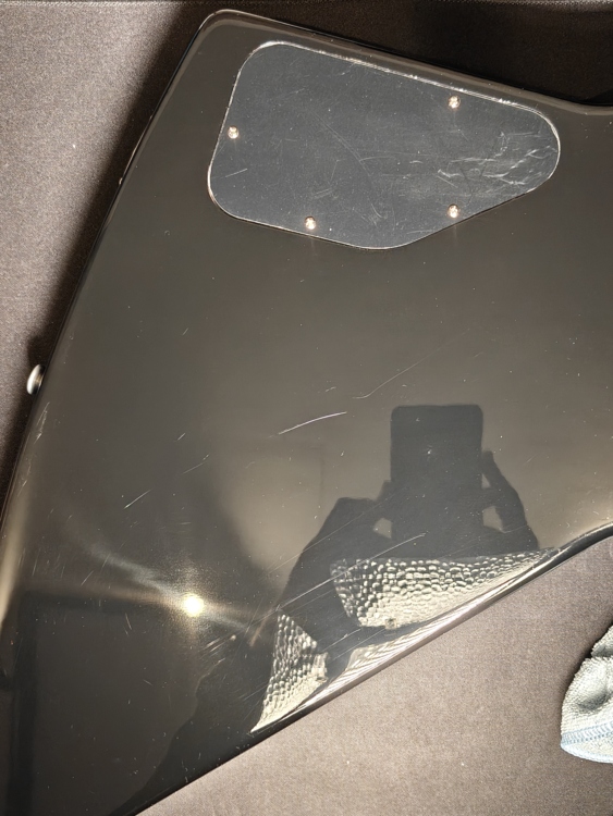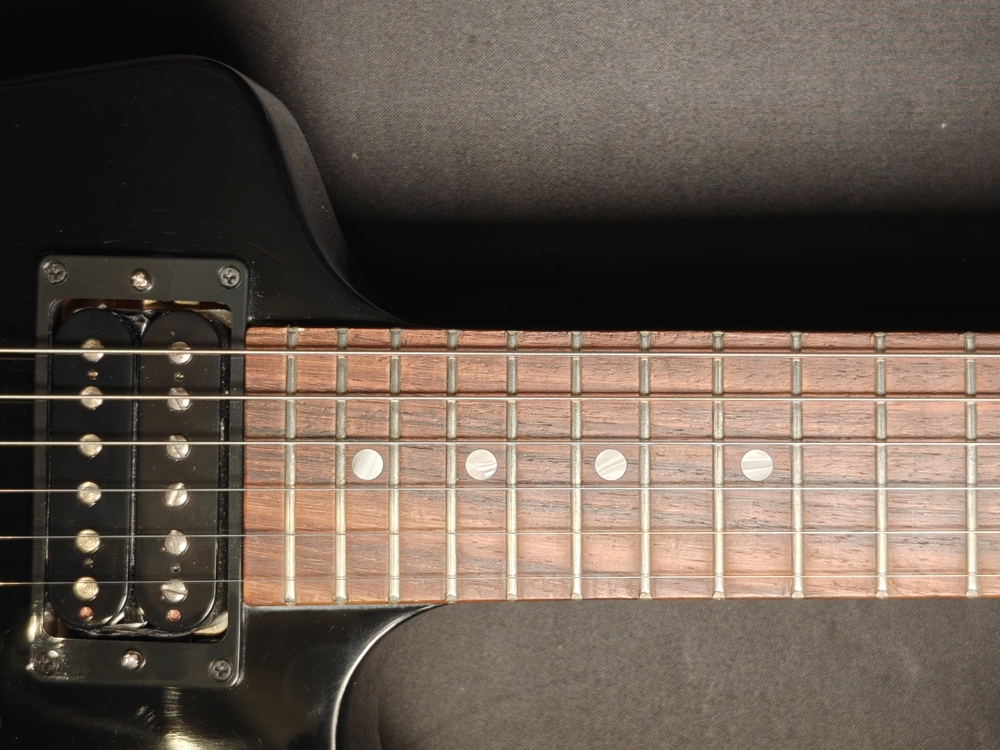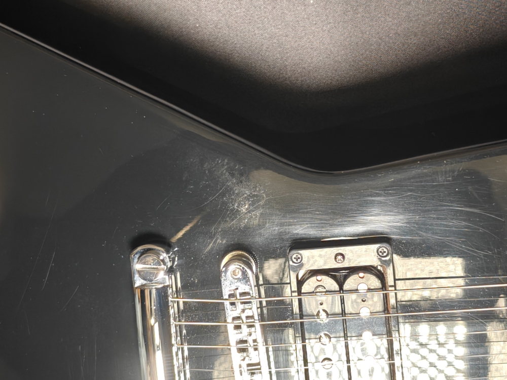 Gitara używana, w bardzo dobrym stanie, posiada delikatne zarysowania wynikające z normalnego użytkowania widoczne pod światło, oraz zmatowienia lakieru w okolicy dolnej tylnej krawędzi oraz po lewej stronie mostka. Naturalny proces przy czarnych błyszczących lakierach nitrocelulozowych.