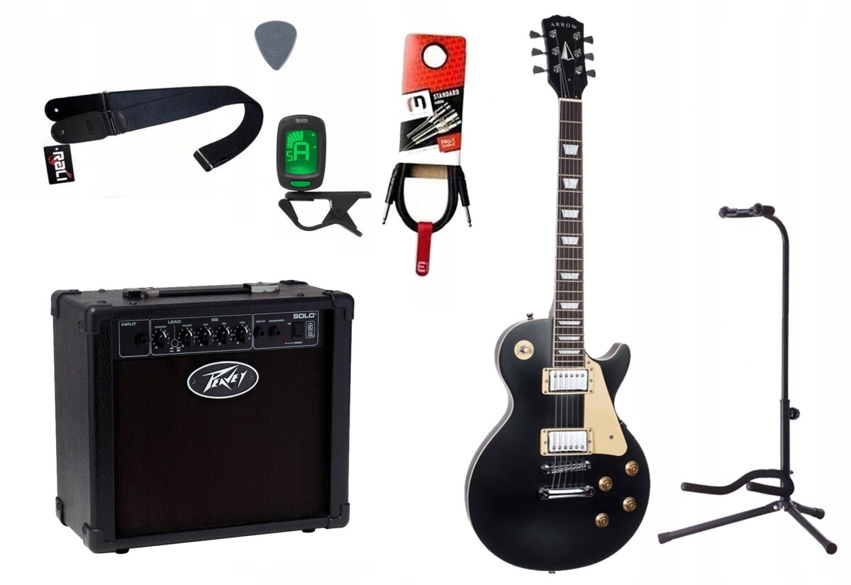 GITARA ELEKTRYCZNA + WZMACNIACZ 12W KABEL ZESTAWZestaw gitarowy, elementy zestawu: 1x Gitara elektryczna (opis poniżej), 1x Combo gitarowe 12W (PEAVEY Solo Guitar Amp), 1x Kabel gitarowy 3m (Red’s Music GC1130BX), 1x Statyw do Gitary (Hamilton Stands KB-303), 1x Tuner gitarowy (Nexon), 1x Pasek do gitary (Rali Nylon70), 1x Kostka gitarowa (Janicek).