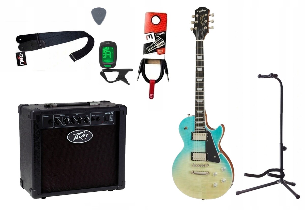 Zestaw gitarowy, elementy zestawu: 1x Gitara elektryczna (opis poniżej), 1x Combo gitarowe 12W (PEAVEY Solo Guitar Amp), 1x Kabel gitarowy 3m (Red’s Music GC1130BX), 1x Statyw do Gitary (Hamilton Stands KB-303), 1x Tuner gitarowy (Nexon), 1x Pasek do gitary (Rali Nylon70), 1x Kostka gitarowa (Janicek).