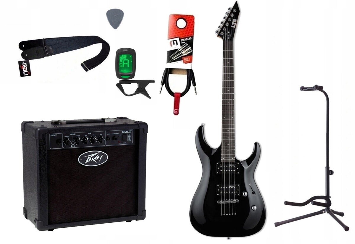 GITARA ELEKTRYCZNA + WZMACNIACZ 12W KABEL ZESTAWZestaw gitarowy, elementy zestawu: 1x Gitara elektryczna (opis poniżej), 1x Combo gitarowe 12W (PEAVEY Solo Guitar Amp), 1x Kabel gitarowy 3m (Red’s Music GC1130BX), 1x Statyw do Gitary (Hamilton Stands KB-303), 1x Tuner gitarowy (Nexon), 1x Pasek do gitary (Rali Nylon70), 1x Kostka gitarowa (Janicek).