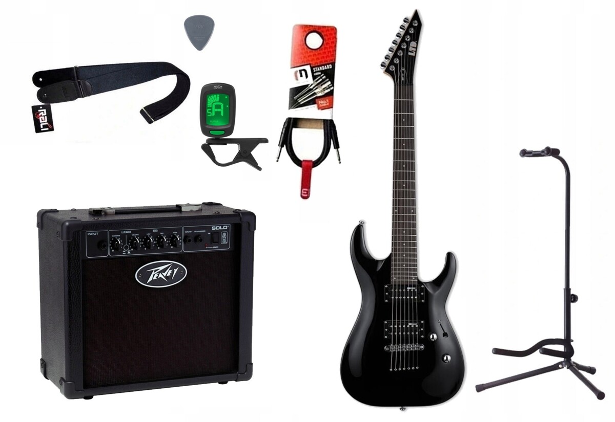 LTD MH-17 KIT BLK BLACK7-strunowa Gitara elektryczna z serii MH, w kolorze czarnym (BLK Black), mostek TOM / String Thru, wbudowany tuner LTDSeria LTD 10 jest przeznaczona dla początkujących i graczy z ograniczonym budżetem, którzy nadal chcą mieć solidny instrument za rozsądne pieniądze. W zestawie MH-17 znajduje się zarówno doskonała gitara siedmiostrunowa na początek, jak i pokrowiec na instrument, dzięki któremu będziesz mógł zabierać go na lekcje lub do domu przyjaciół na wesołe jamowanie. Gitary siedmiostrunowe świetnie sprawdzają się w nowoczesnych stylach muzycznych, takich jak metal czy rock progresywny, gdzie możesz chcieć grać niżej niż standardowy zakres dźwięków oferowany przez gitary sześciostrunowe.MH-17 posiada gładką, wygodną, cienką szyjkę klonową w kształcie litery U, która ułatwia poruszanie się po akordach i skalach na całej podstrunnicy z 24 progami extra-jumbo. Posiada dobrze wyważony i wyprofilowany korpus z drewna basowego, który nadaje się do gry w pozycji siedzącej lub stojącej. Kiedy jesteś gotowy dać czadu, przetworniki ESP Designed w MH-17 są świetne do każdego gatunku muzyki, który lubisz grać. Dostępna w wykończeniu Black.DANE TECHNICZNE:Konstrukcja: Bolt-OnSkala: 25,5”Korpus: drewno basoweSzyjka: KlonPodstrunnica: Twarde drewnoPromień podstrunnicy: 350mmWykończenie: CzarnySzerokość nakrętki: 48mmTyp nakrętki: FormowanaKontur szyjki: Cienkie UFrezy/Typ: 24 XJOsprzęt: chromPrzycisk paska: StandardowyTunery: LTDMostek: TOM / String ThruNeck PU: ESP Designed LH-100NMostek PU: ESP Designed LH-100BElektronika: PasywnaUkład elektroniki: Przełącznik głośności/tonów/3-drożnyStruny: DAddario 010-059Pokrowiec Gigbag: Tak