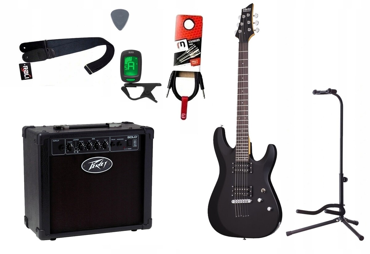 Zestaw gitarowy, elementy zestawu: 1x Gitara elektryczna (opis poniżej), 1x Combo gitarowe 12W (PEAVEY Solo Guitar Amp), 1x Kabel gitarowy 3m (Red’s Music GC1130BX), 1x Statyw do Gitary (Hamilton Stands KB-303), 1x Tuner gitarowy (Nexon), 1x Pasek do gitary (Rali Nylon70), 1x Kostka gitarowa (Janicek).