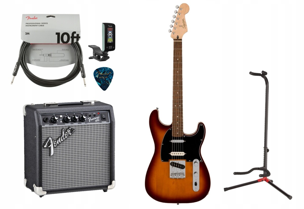 Komplenty Zestaw gitarowy: 1x gitara elektryczna (opis poniżej), 1x wzmacniacz gitarowy (Fender Frontman 10), 1x kabel gitarowy (Fender Professional Series Instrument Cable, Straight/Straight, 10′, Black 3 metry), 1x statyw gitarowy (Fender Adjustable Guitar Stand), 1x tuner gitarowy (Fender Original Tuner DBL), 1x kostka gitarowa (Fender Premium Celluloid 351 Shape Picks, Medium, Ocean Turquoise).