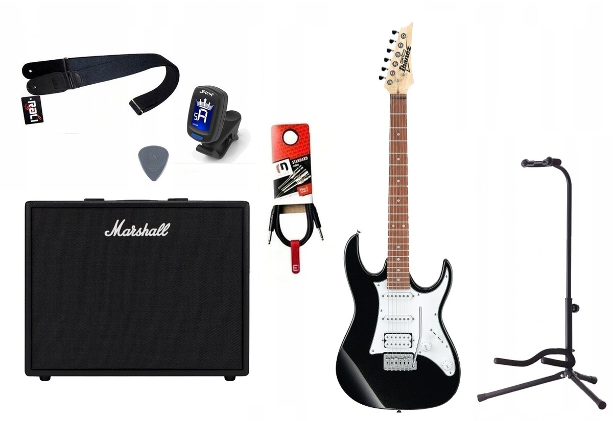 Zestaw gitarowy, elementy zestawu: 1x Gitara elektryczna (opis poniżej), 1x Combo gitarowe 50W (Marshall CODE 50), 1x Kabel gitarowy 3m (Red’s Music GC1130BX), 1x Statyw do Gitary (Hamilton Stands KB-303), 1x Tuner gitarowy (Jeremi A9), 1x Pasek do gitary (Rali Nylon70), 1x Kostka gitarowa (Janicek).