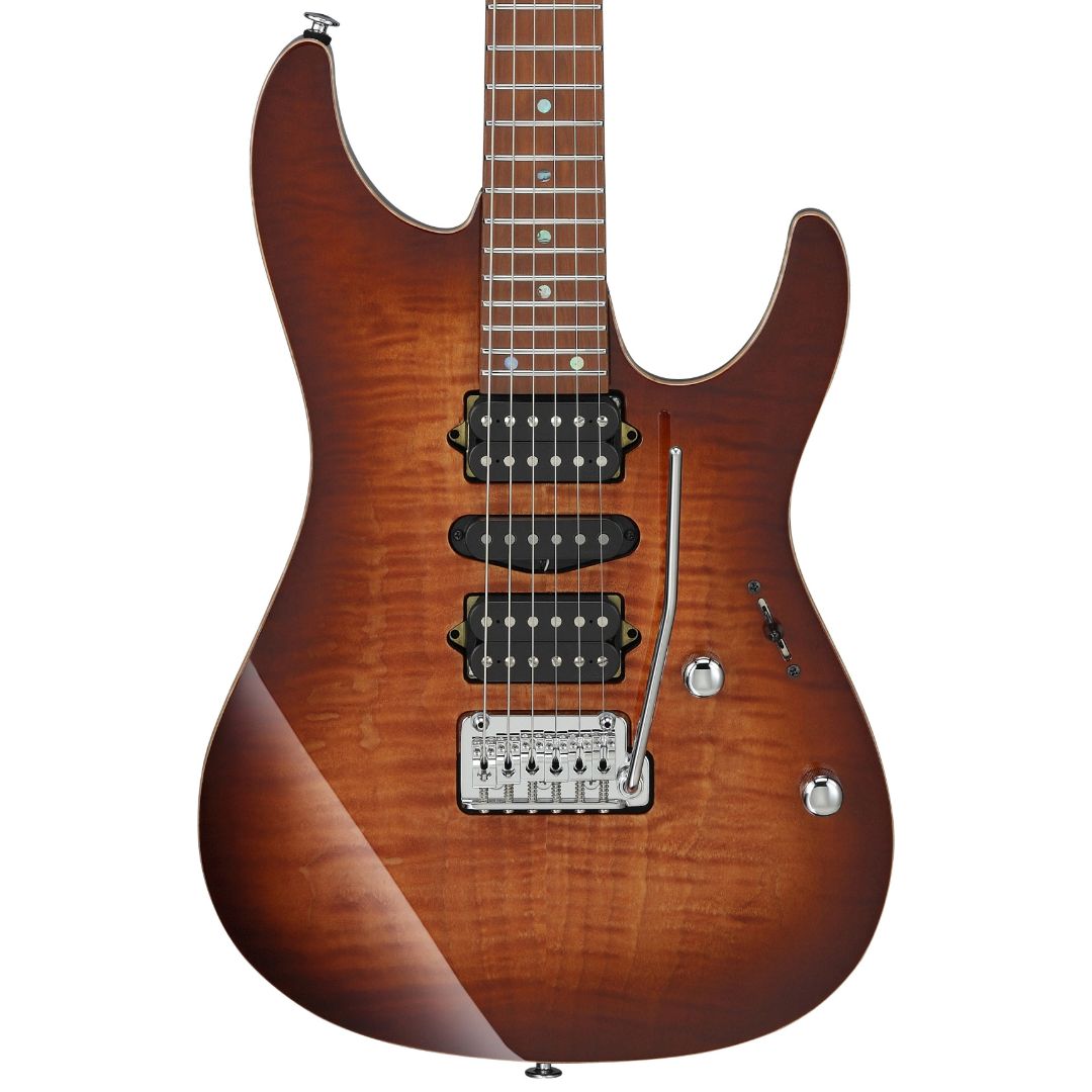 Sercem brzmieniowym gitary Ibanez AZ2407F-BSR są przetworniki DiMarzio – Air Norton na gryfie, True Velvet w środku oraz The Tone Zone przy mostku. Ta kombinacja oferuje głębię, ciepło i bogate dynamiczne możliwości, szczególnie w połączeniu z 5-pozycyjnym przełącznikiem. Przetworniki te zostały starannie dobrane, aby zapewnić wszechstronność brzmieniową – od ciepłych, jazzowych tonów, przez bluesowe brzmienia, aż po ostre, rockowe riffy. Kostka wykonana z kości nasączonej olejem zapewnia doskonałą stabilność strojenia i ciepłe, bogate rezonanse. Most Gotoh T1502S wyposażony jest w stalowe siodełka i stalowy blok tremolo, co przekłada się na szybką odpowiedź i lepszą artykulację. Rozstaw strun wynoszący 10,5 mm ułatwia granie kostką, a konstrukcja typu snap-in sprawia, że ramię tremolo można łatwo zamontować.