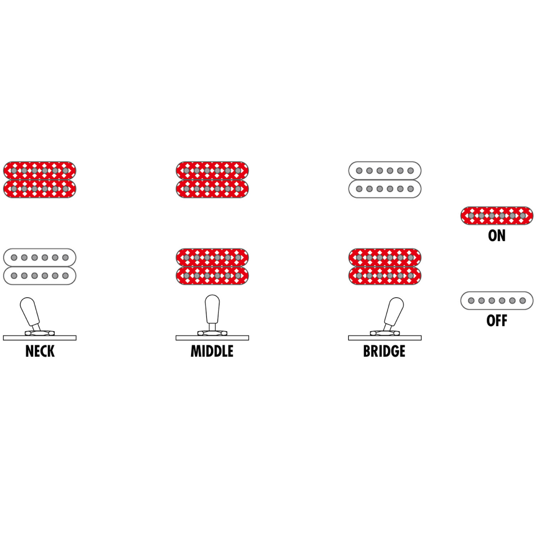 Ustawienia przystawek 3-pozycyjny przełącznik | Pozycja 1. Mostek, Pozycja 2. Mostek i Gryf, Pozycja 3. Gryf