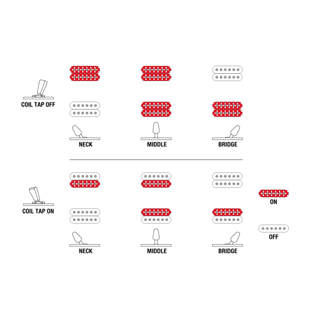 Ustawienia przystawek 3-pozycyjny przełącznik | Pozycja 1. Mostek, Pozycja 2. Mostek i Gryf, Pozycja 3. Gryf