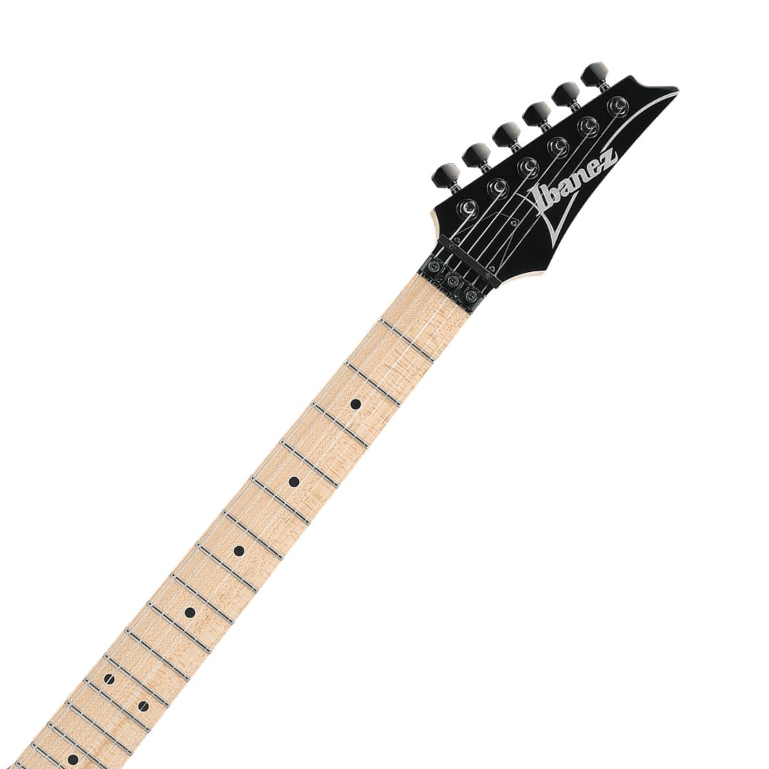 Jednym z najbardziej charakterystycznych elementów gitary Ibanez RG550-BK jest jej wyjątkowy gryf Super Wizard wykonany z pięciu warstw klonu i orzecha. Profil tego gryfu został zaprojektowany z myślą o maksymalnej szybkości i komforcie gry, co docenią szczególnie gitarzyści wykonujący skomplikowane partie solowe czy szybkie riffy. Grubość gryfu wynosząca zaledwie 17 mm przy pierwszym progu i 19 mm przy dwunastym sprawia, że nawet długie sesje grania nie powodują zmęczenia dłoni. Podstrunnica klonowa z 24 jumbo progami zapewnia precyzję podczas gry, a czarne, punktowe markery ułatwiają orientację na gryfie. Promień podstrunnicy wynoszący 430 mm idealnie współgra z mostkiem Edge, umożliwiając niskie ustawienie strun bez obawy o brzęczenie. Szerokość gryfu przy nakrętce wynosząca 43 mm daje komfortową przestrzeń do gry akordowej, a 58 mm przy 24 progu zapewnia swobodę podczas technicznych solówek.