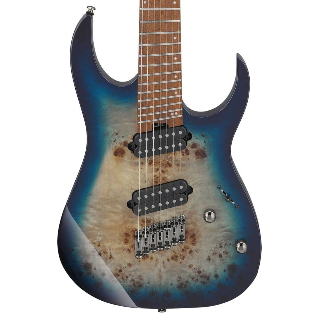 Siedmiostrunowa gitara elektryczna RGMS7PB-CBS wykorzystuje innowacyjną konstrukcję gryfu o zmiennej menzurze 686-648mm, która zapewnia zrównoważone napięcie strun i otwarte, żywe brzmienie. Instrument został zaprojektowany z myślą o ergonomii – kąt nachylenia progów idealnie współgra z naturalnym układem dłoni gitarzysty, co znacząco ułatwia szybką grę. Progiem neutralnym jest próg 12, co sprawia, że gra w wysokich pozycjach staje się intuicyjna i komfortowa.