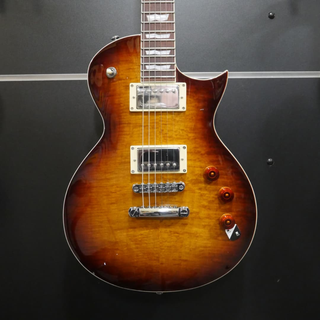 EC-256FM DBSB posiada korpus z mahoniu, wygodny trzyczęściowy cienki gryf z mahoniu w kształcie U oraz podstrunnicę z prażonej jatoby z inkrustacjami w kształcie flagi i 22 progami extra jumbo. Wykończenie w kolorze Dark Brown Sunburst dodaje gitarze eleganckiego wyglądu.