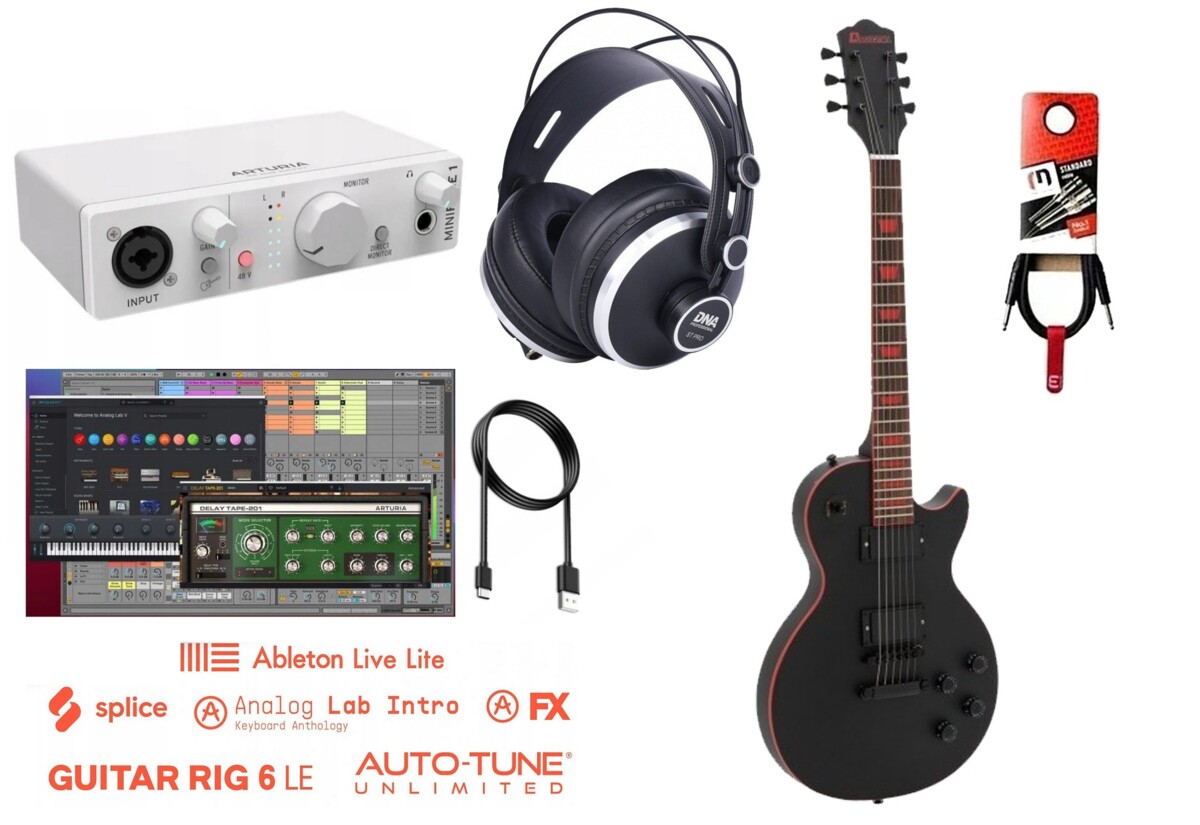 Zestaw do nagrywania gitary elektrycznej, Recording Guitar:Gitara elekryczna, kabel, Interfejs Audio (soft dołączony do urządzenia), SłuchawkiElementy zestawy: 1x Gitara elektryczna (opis poniżej), 1x Interfejs Audio USB (Arturia MiniFuse 1 WH), 1x Słuchawki Studyjne (DNA ST-PRO), 1x Kabel gitarowy 3 metrowy (Reds Music GC1130BX)