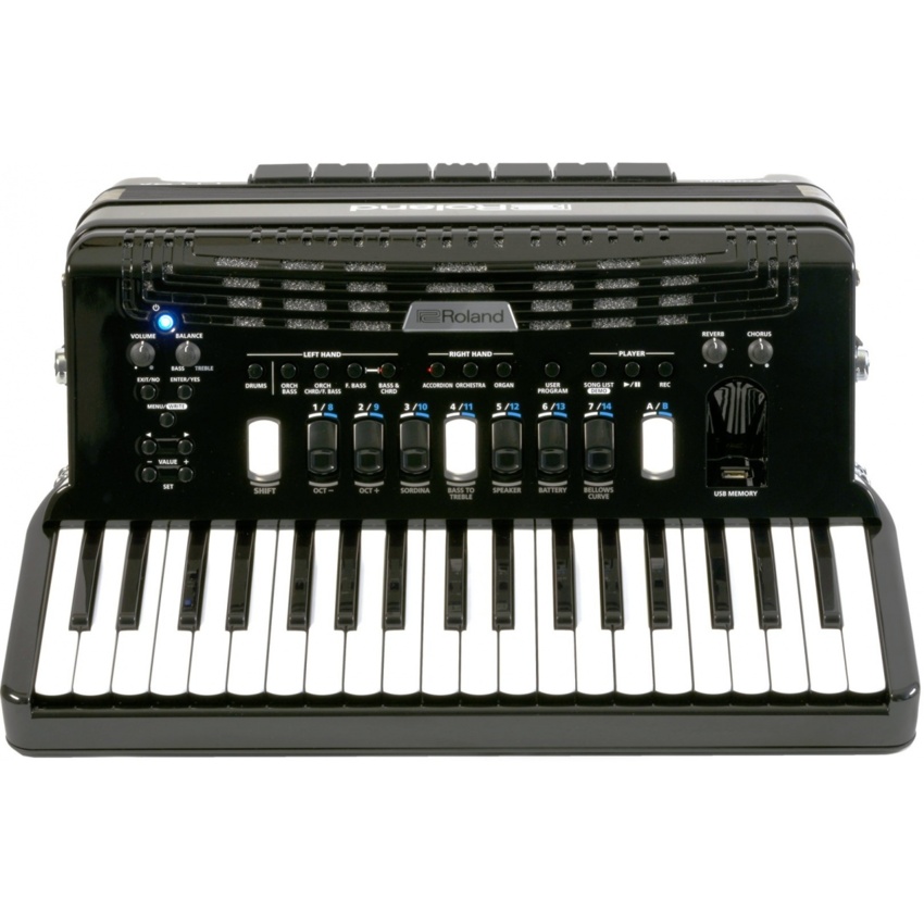 Ćwiczenia. Próba. Studio. Estrada. Akordeon FR-4x firmy Roland jest elastyczny, aby wspierać muzyka wszędzie tam, gdzie gra. Gniazdo słuchawkowe umożliwia ćwiczenie w domu bez niepokojenia sąsiadów, a gdy jesteś w drodze, mocny system nagłośnienia z dwoma głośnikami i głośnikiem wysokotonowym dostarczają wielki, pełnozakresowy dźwięk. Ambitni twórcy muzyki mogą nawet podłączyć zewnętrzne urządzenia MIDI, takie jak moduł BK-7m firmy Roland, aby używać sterowanego akompaniamentu. Muzycy koncertujący docenią fakt, że akordeon jest w pełni przygotowany do używania na estradzie, zapewniając bezpośrednią łączność z systemem nagłośnienia danej imprezy poprzez gniazdo wyjścia liniowego i eliminując bóle głowy, spowodowane próbami obstawiania mikrofonami tradycyjnego akordeonu.