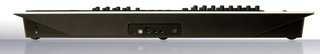 - gniazda: pedał sustain (1/4#8221; TS), pedał ekspresji (1/4#8221; TS), MIDI Out (DIN 5pin), USB, USB Micro B (dla zewnętrznego zasilania – sprzedawany oddzielnie)