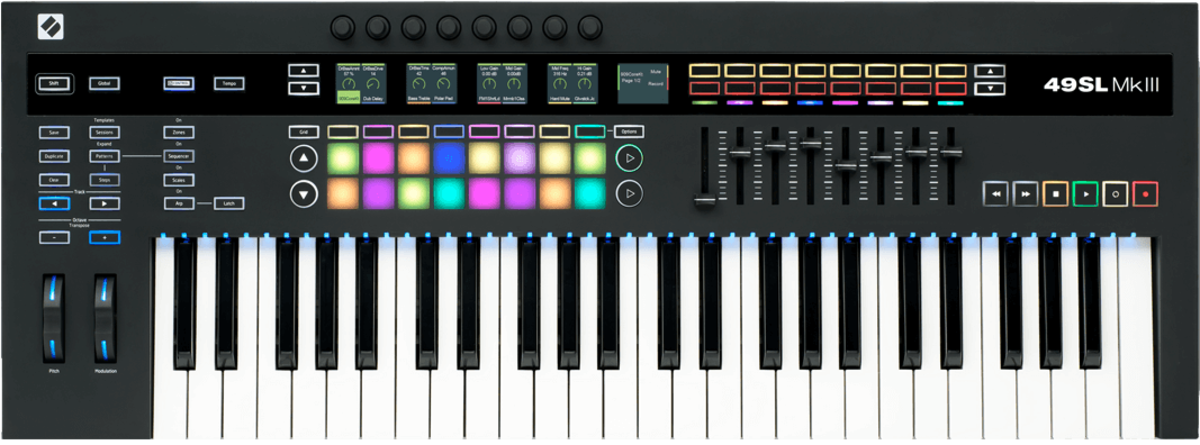 NOVATION 49SL MkIII to kompleksowa i wielofunkcyjna klawiatura sterująca z 49 klawiszami, 16 podświetlanymi padami RGB, 8 enkoderami, 8 suwakami i 6 przyciskami do sterowania transportem. Dzięki pięciu kolorowym ekranom TFT Tworzenie swoich utworów staje się łatwe i szybkie. Współpraca z oprogramowaniem DAW bez konieczności patrzenia na ekran komputera, półważona klawiatura ze sprężynową akcją pozwalają na kreatywne podejście do tworzenia własnej muzyki.