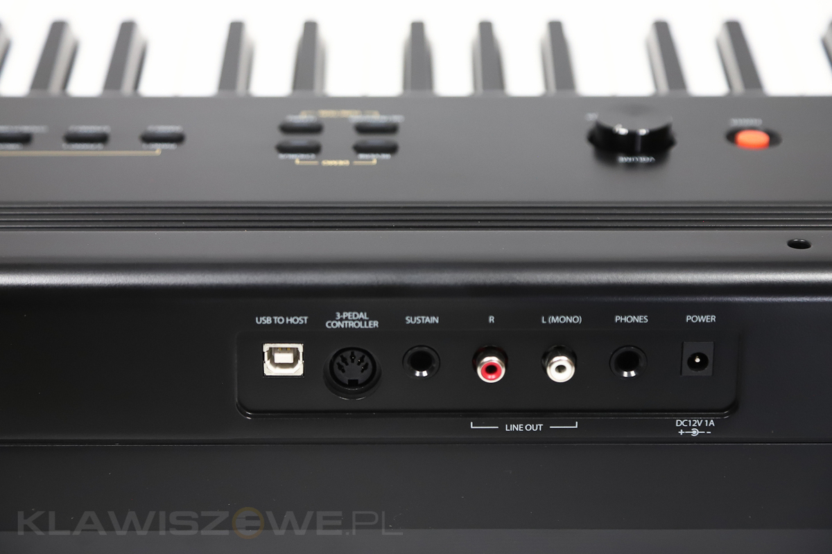 Wejścia: USB, MIDI Out, pedału Sustain, Line Out L/R, słuchawkowe 1/4″, DC