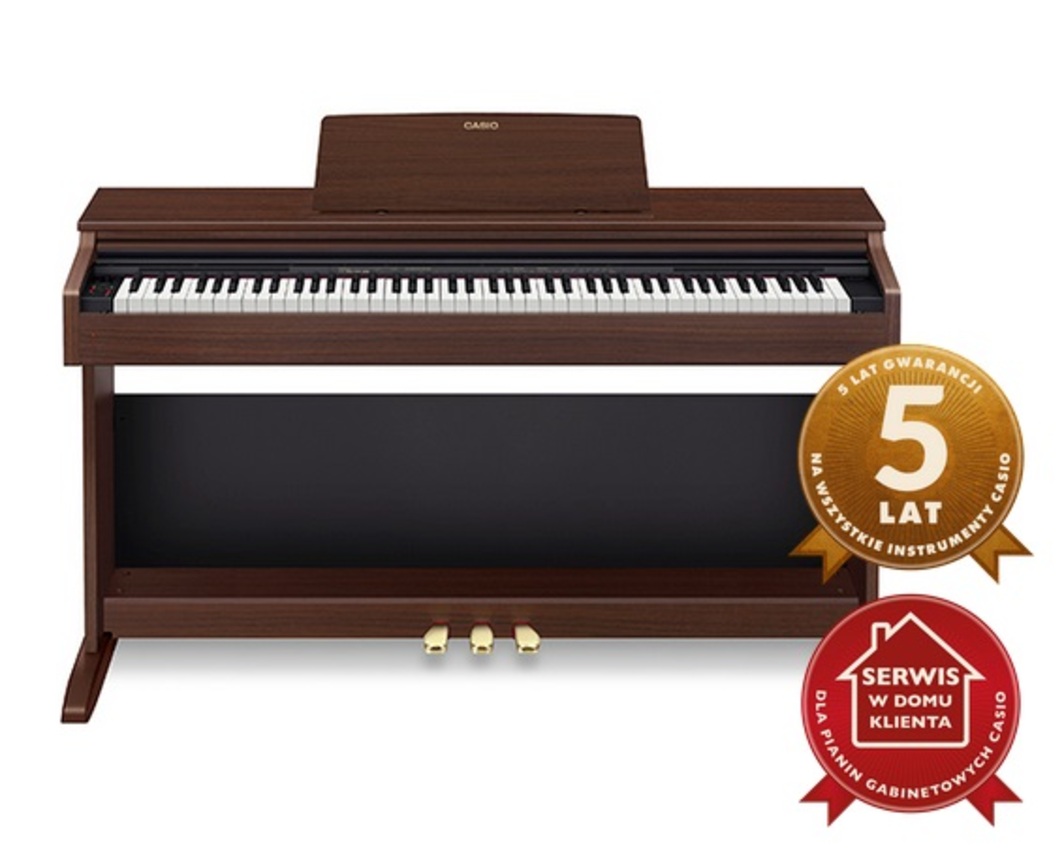 CASIO AP-270 to domowe pianino cyfrowe posiadające 88 dynamicznych klawiszy z ważoną mechaniką młotkową Tri-sensor Scaled Hammer Action Keyboard II. Model ten dobrze odwzorowuje grę na fortepianie i posiada trzy stopnie czułości klawiatury. Dzięki funkcji Duet Mode umożliwiającej podział klawiatury na dwie równe części, spełnia walory edukacyjne – na jednej połowie klawiatury może grać nauczyciel, na drugiej uczeń. Dzięki zastosowaniu materiałów oraz technologii najwyższej jakości gwarancja na instrument wynosi aż 5 lat a ewentualny serwis odbywa się w domu klienta – bez konieczności wysyłania pianina.