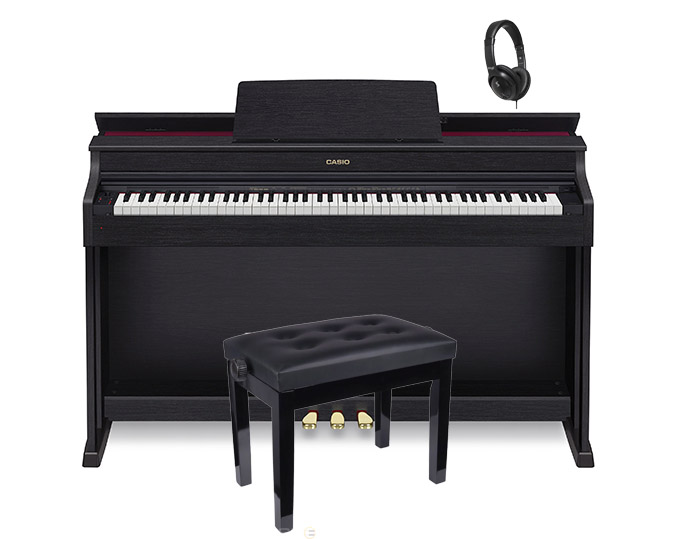 Pianino cyfrowe CASIO AP-470 z serii Celviano posiada 88 dynamicznych klawiszy z ważoną mechaniką młotkową Tri-sensor Scaled Hammer Action Keyboard II. Możliwość podnoszenia wieka i wykończenie klawiszy syntetycznym hebanem i kością słoniową podkreśla stylowy charakter tego modelu. Doskonale sprawdzi się też jako pianino dla początkujących dzięki funkcji Duet Mode, która umożliwia podział klawiatury na dwie równe części (nauczyciel może pokazać uczniowi jedną partię bez konieczności przesiadania się). Sterowanie instrumentem jest możliwe również z pozycji tabletu lub telefonu przez aplikację Chordana Play for Piano
