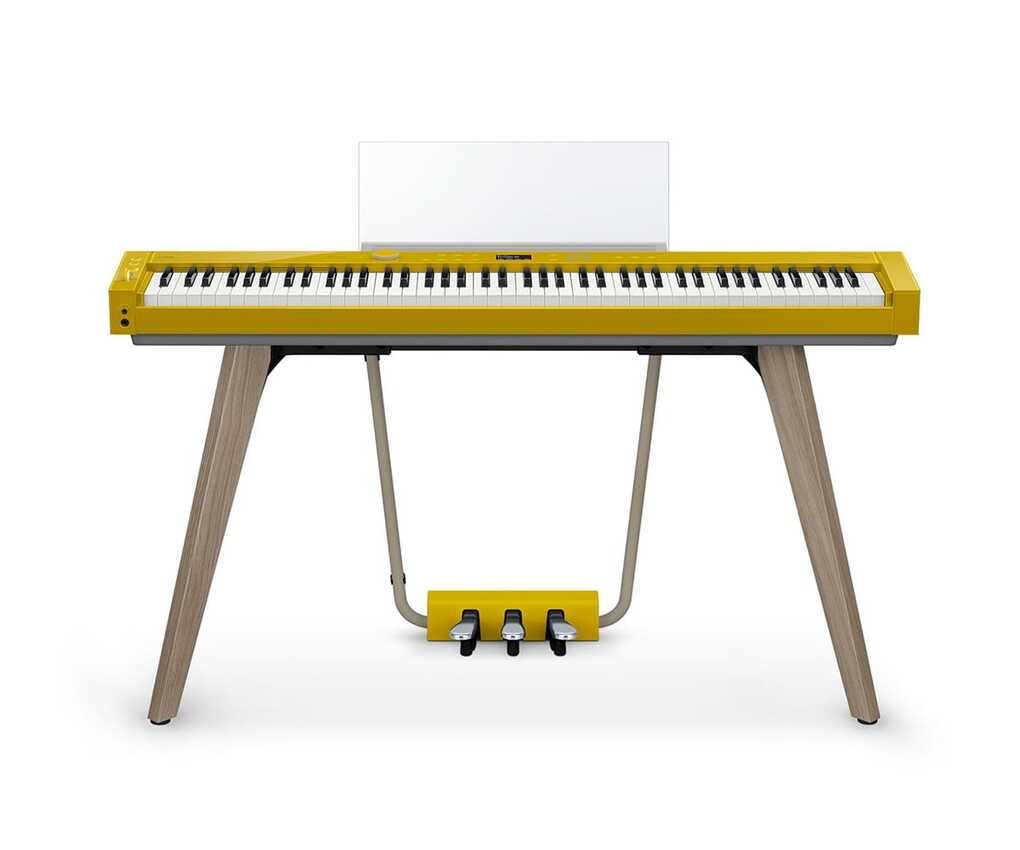 Model PX-S7000 jest dostępny w 3 kolorach, czarnym, białym oraz w unikalnej nowej odmianie kolorystycznej, którą lubimy nazywać „Harmonious Mustard”. „Harmonious Mustard” to szczególnie wyjątkowy kolor, który jest rzadko używany w przypadku pianin. Ten elegancki i ciepły kolor został opracowany w wyniku dokładnych badań aktualnych trendów w projektowaniu wnętrz w Europie i został wybrany ze względu na jego zdolność do naturalnego wtapiania się w szeroką gamę stylowych przestrzeni mieszkalnych. Model PX-S7000 jest wyposażony w zintegrowaną podstawkę wykończoną słojami drewna