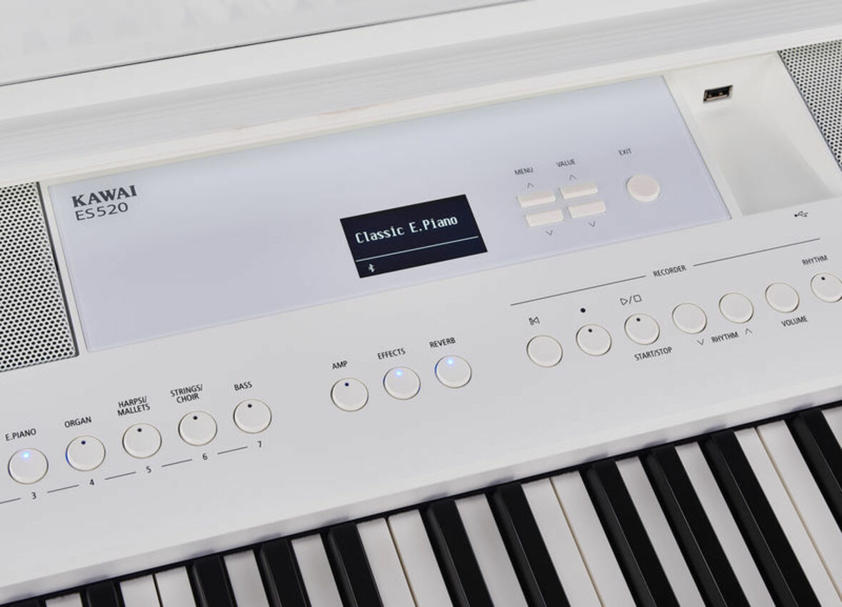 Ponadto ES520 posiada również charakterystyczne brzmienie wysoko cenionego fortepianu koncertowego EX firmy Kawai, które zostało wybrane przez profesjonalnych pianistów na tak prestiżowych imprezach, jak między innymi międzynarodowe konkursy pianistyczne im. Chopina, Czajkowskiego i Rubinsteina.