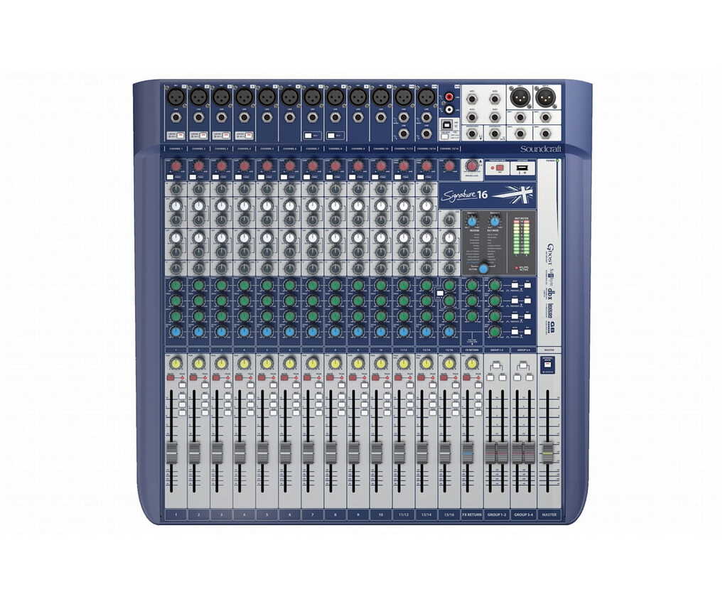 Doskonałe brzmienie i funkcjonalność za nadzwyczaj niską cenę. Mikser uniwersalny (kompaktowy) z serii Signature™ angielskiej firmy Soundcraft należącej do Harman Pro Group.Do instalacji nagłośnieniowych, na scenę… * 12 wejść mono ** „brytyjska korekcja” ** Legendarne przedwzmacniacze Ghost, najnowsza generacja korektorów Sapphyre,3 wyjścia aux przełączane pre/post, procesor efektów Lexicon, nagrywanie i odtwarzanie 2 kanałów audio z USB,4 podgrupy limitery dbx w czterech kanałach wejściowych, 2 wbudowane wejścia z di-boxem, filtr górnoprzepustowy w każdym torze Model: SIGNATURE 16 • 12 torów monofonicznych mic/line(xlr + jack) • 2 tory stereofoniczne (jack)1 wejście stereo RCA • 1 wejście stereo RCA • Tory mono : gniazdo insert, 3-pasmowy korektor, phantom, 3 wyjścia aux przełączane pre/post, wycisz. toru, tłumik suwakowy( 100 mm) • Tory stereo : 3-pasmowy korektor, 3 wyjścia pomoc.(aux), wycisz. toru, tłumik suwakowy • Główne regulatory poziomu wyjściowego – suwakowe, miernik poziomu – 10-punktowy, montaż w standardzie rack 19″