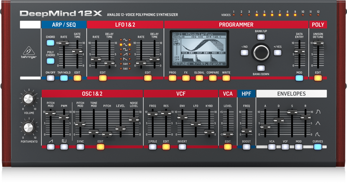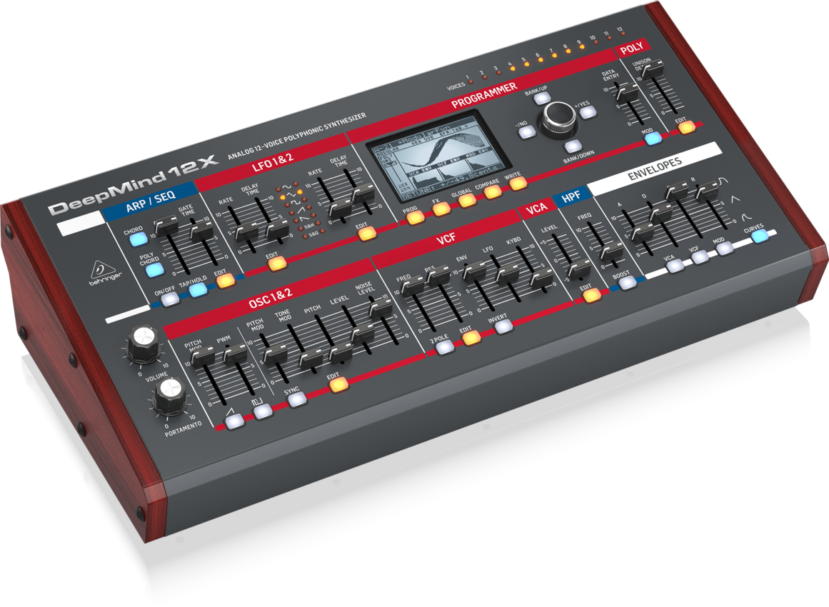 Behringer DEEPMIND 12XD – W pełni analogowy, 12-głosowy, polifoniczny syntezator z 4 silnikami FX, 2 oscylatorami OSC i LFO na każdy z głosów, 3 generatorami obwiedni ADSR, 8-kanałową matrycą modulacyjną, 32 krokowym sekwencerem oraz z możliwością zdalnej kontroli za pomocą tabletu. Teraz w nowym wykończeniu kolorystycznym.