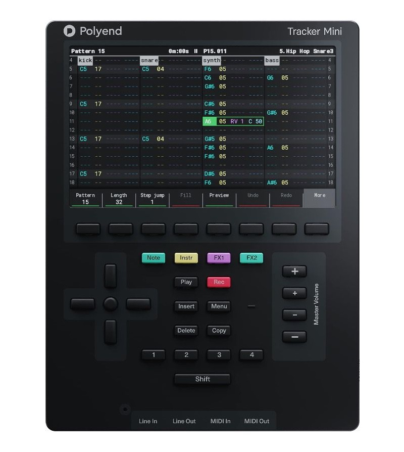 Projekty stworzone na oryginalnym Trackerze są w pełni kompatybilne z Mini, co pozwala Ci zacząć utwór w studio i dokończyć go w drodze. Tracker Mini ma pełną implementację MIDI, co pozwala sterować dowolnym sprzętem zewnętrznym lub używać go jako części większej konfiguracji. Dla większej wygody, można go również podłączyć do klawiatury MIDI, aby wprowadzać akordy.
