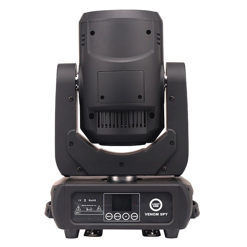 LIGHT4ME VENOM SPOT 150 SPY RING to profesjonalna ruchoma głowica LED z serii Venom, wyposażona w mocną, 150-watową białą diodę, wysokiej jakości optykę oraz system 24 półwatowych diod RGB otaczających zewnętrzną soczewkę. Dzięki takiemu rozwiązaniu reflektor sceniczny może generować dodatkowe, widowiskowe efekty świetlne. Sprzęt doskonale sprawdza się w czasie różnego rodzaju pokazów, występów estradowych, prezentacji, eventów oraz koncertów na małych i średnich scenach.Podzespoły głowicy ruchomej VENOM SPOT 150 SPY RING zamknięte zostały w solidnej, wykonanej z wytrzymałego, czarnego tworzywa sztucznego, zwartej obudowie. Przemyślana konstrukcja pozwoliła zmniejszyć masę całego urządzenia do 8,7 kg co czyni ten reflektor sceniczny najlżejszym, a zarazem najbardziej mobilnym i wysoce funkcjonalnym oświetleniem scenicznym z rodziny Venom. Sprzęt wyposażony został w rotacyjną tarczę kolorów, na której znajduje się 7 barwnych filtrów. Ponadto posiada dwie tarcze gobo – statyczną i obrotową – na których znajduje się łącznie 12 zróżnicowanych wzorów kształtujących promień świetlny. Dodatkową zaletą głowy LED jest możliwość tworzenia efektu przypominającego ruch wody, a także 3-ramienna pryzma rozszczepiająca wiązkę światła. Główną soczewkę otacza w pełni programowalny ledowy ring zbudowany z 24 diod RGB. Całość dopełnia zmotoryzowany focus zapewniający pełną kontrolę nad ostrością krawędzi wzorów wyświetlanych na powierzchniach.Dolna część VENOM SPOT 150 SPY RING wyposażona została w dwie szybkozłączki, umożliwiające ruchomej głowicy pracę na rampach oświetleniowych i kratownicach w pozycji wiszącej. Do wygodnego i bezpiecznego przenoszenia zastosowano solidne uchwyty znajdujące się po obu stronach podstawy reflektora scenicznego. W tylnej części umieszczone zostały złącza zasilania, w tym tzw. „podaj dalej umożliwiające przekazywanie napięcia bezpośrednio z urządzenia do urządzenia, oraz wejścia i wyjścia XLR dla sygnałów sterujących DMX. W części przedniej znajduje się panel sterowania w postaci czytelnego, kolorowego wyświetlacza LCD oraz czterech przycisków (Menu, Enter, Up, Down). Za ich pomocą możemy wybrać jeden spośród kilku trybów pracy urządzenia:auto, w którym reflektor działa samodzielnie wykorzystując do tego celu wbudowane programy pracy;sound, w którym ledowa głowica synchronizuje swoją pracę z dźwiękami muzyki płynącymi z otoczenia za pomocą bardzo czułego, wbudowanego mikrofonu;master/slave, gdy poszczególne jednostki łączone są ze sobą szeregowo za pośrednictwem gniazd i przewodów DMX, a sposób działania jednego z urządzeń powielany jest przez pozostałe, co tworzy wrażenie pracy synchronicznej całego zestawu;DMX, gdy do kontrolowania pracy pojedynczego reflektora lub grupy jednostek wykorzystywane są zewnętrzne pulpity, konsole i systemy sterowania.Przed przegrzaniem i uszkodzeniem głowicy LED zabezpiecza specjalnie zaprojektowany system ochronny. Kiedy temperatura urządzenia osiąga 40°C automatycznie załączają się ciche wentylatory, natomiast w przypadku dalszego wzrostu temperatury i osiągnięciu 70°C, moc świecenia diody zmniejsza się o połowę.LIGHT4ME VENOM SPOT 150 SPY RING to wysokiej jakości głowica ruchoma LED, która świetnie sprawdza się jako oświetlenie dla mobilnego DJ-a, zespołu weselnego czy firmy eventowej. Reflektor znajduje zastosowanie na różnego typu scenach, w domach i ośrodkach kultury, a także w pubach i dyskotekach, tworząc efektowną oprawę świetlną. Ta dobrze wykonana, a jednocześnie stosunkowo tania ruchoma głowica LED dostępna jest w najlepszej cenie od sklepu muzycznego Lighting Center!