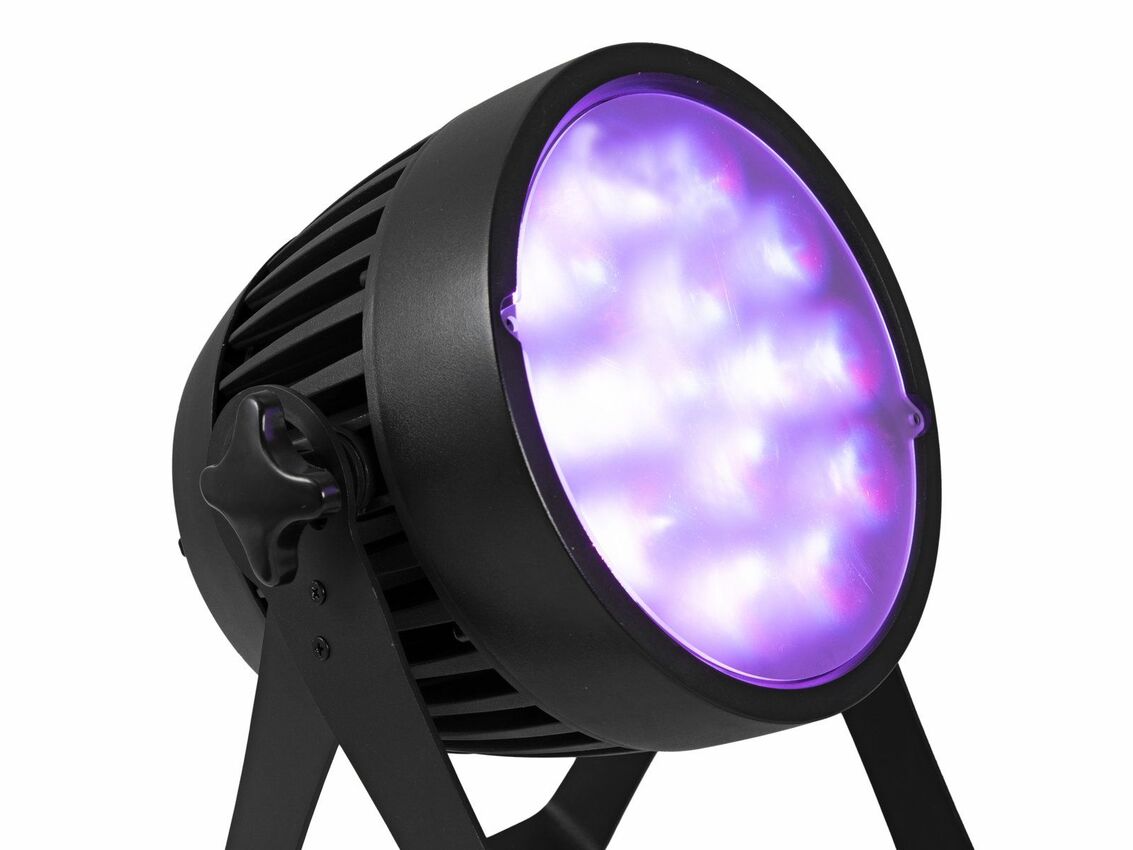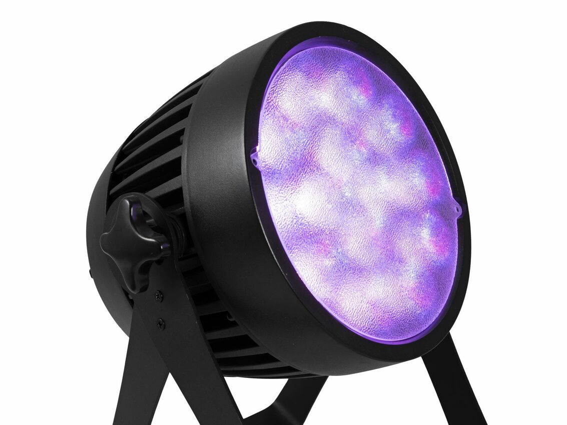 Zasilany bateryjnie reflektor IP65 z diodami LED RGBWA+UV, QuickDMX, osłonami dyfuzora i pilotem na podczerwień