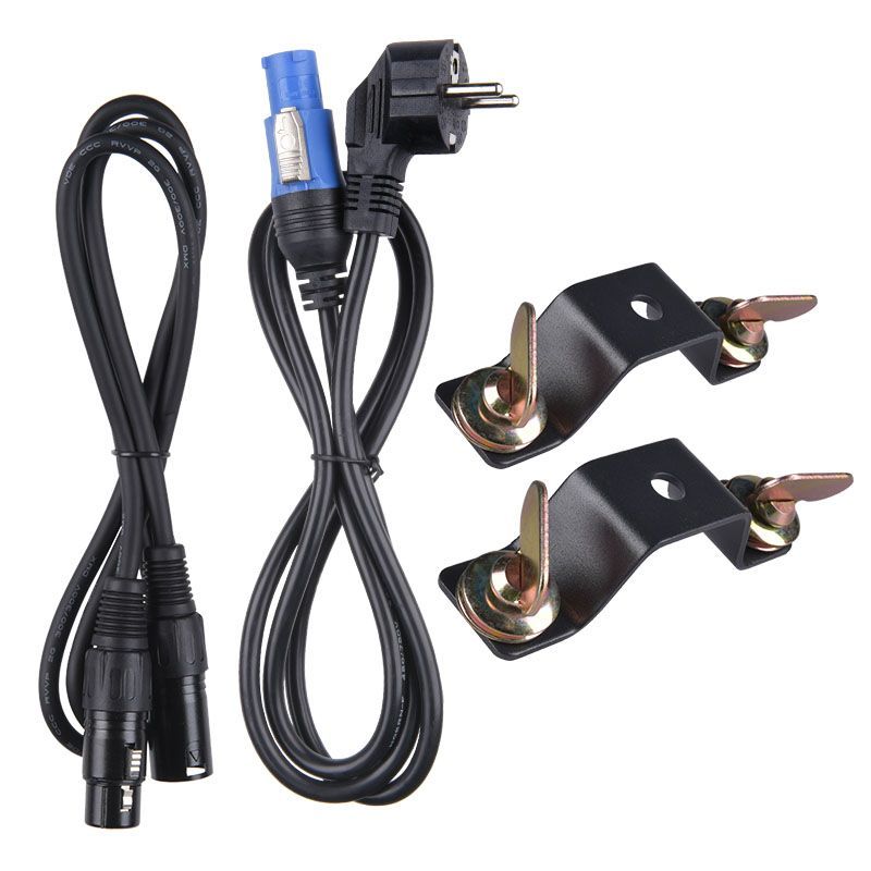 W zestawie: 2 uchwyty montażowe, przewód DMX, przewód zasilający, instrukcja obsługi