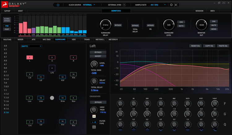 Dedykowana aplikacja oddaje w nasze ręce ponad 23 przygotowane formaty monitorowania sygnału od klasycznej stereofonii po coraz bardziej niezbędny w pracy miksierskiej czy masteringowej Dolby Atmos w konfiguracjach: 5.1.2, 7.1.4 czy 9.1.6. Znajdziemy tu również systemy: 2.1, 5.1, 7.1 surround, DTS:X, Аmbisonics (do 3-ciej harmonicznej), Auro 3D oraz wiele innych. Mamy również możliwość tworzenia własnych systemów, odpowiednio wykorzystując do tego matrycę trasowania sygnału, co często sprawdzi się podczas wspomnianych instalacji koncertowych, czy przedstawień teatralnych.
