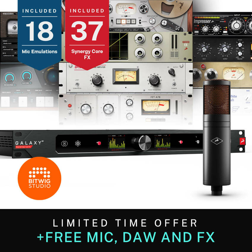 Uzbrojony w rewolucyjną technologię procesowania efektów, GALAXY 32 daje nam dostęp do legendarnego sprzętu studyjnego, na bazie którego powstały emulacje, które możemy wykorzystać w czasie rzeczywistym z praktycznie zerową latencją i co ważne – w żaden sposób nie obciążające procesora komputera, ponieważ wszystko dzieje się wewnątrz interfejsu za pomocą chipów FPGA i DSP. Pokładowy wirtualny rack pozwala na załadowanie aż 128 instancji efektowych, w których skład wchodzą klasyczne preampy, korektory czy kompresory, a nawet wykorzystywany w analogowych konsoletach kompresor bus, który możemy zapiąć na cały zestaw perkusyjny, czy korektor masteringowy do wykorzystania na całej szynie. No i w każdej chwili możemy poszerzyć zestaw o takie perełki jak Grove Hill Liverpool, czy stworzony we współpracy z Antares, legendarny Auto-Tune.