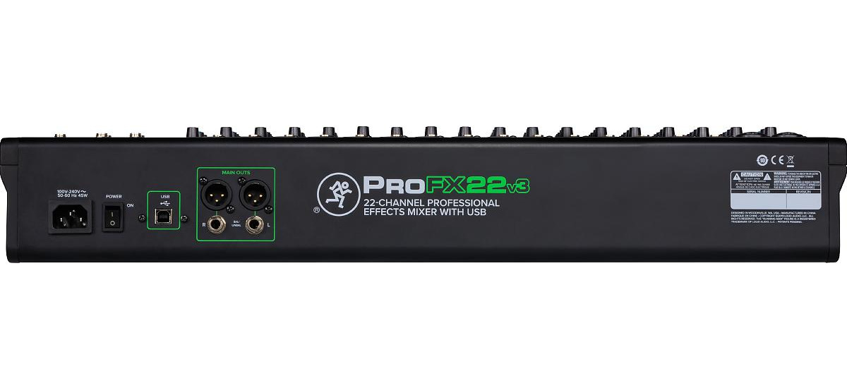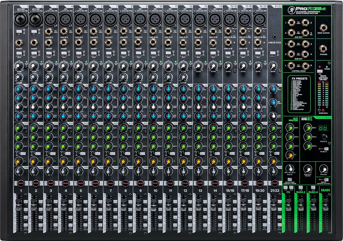 Profesjonalny 22-kanałowy mikser audio z wbudowanym procesorem efektów. Najnowsza odsłona bardzo popularnych mikserów z serii ProFX v3 została wyposażona w legendarne preampy ONYX MIC, które gwarantują krystaliczny i pełny dźwięk w każdej sytuacji. Wbudowany nowy procesor GigFX™ z 24 programami na pokładzie zapewni jeszcze większą kontrolę nad sekcją efektów FX. Dodatkowo dzięki wbudowanemu wyjściu USB 2×4 I/O możemy nagrywać w jeszcze lepszej jakości 24-Bit/192kHz wykorzystując jeden z dwóch dostarczonych do urządzenia oprogramowań: Pro Tools® First i Waveform™ OEM. Wejścia na kanałach 1 i 2 są wyposażone w przycisk Hi-Z pozwalający podpiąć bezpośrednio swoją gitarę, bass lub inne instrumenty bez obawy uszkodzenia Preampu, a na kanałach 1-12 znajduje się wbudowany kompresor. Filtr górnoprzepustowy 100Hz low-cut pozwali na szybkie pozbycie się niechcianych niskich częstotliwości, a przycisk 48V zasili nasze mikrofony pojemnościowe. Dodatkowo model ProFX22v3 posiada trzy wysyłki AUX SEND i 4 Subgrupy. Wymiary (HxWxD): 109x450x434mm, Waga: 9.0 kg.