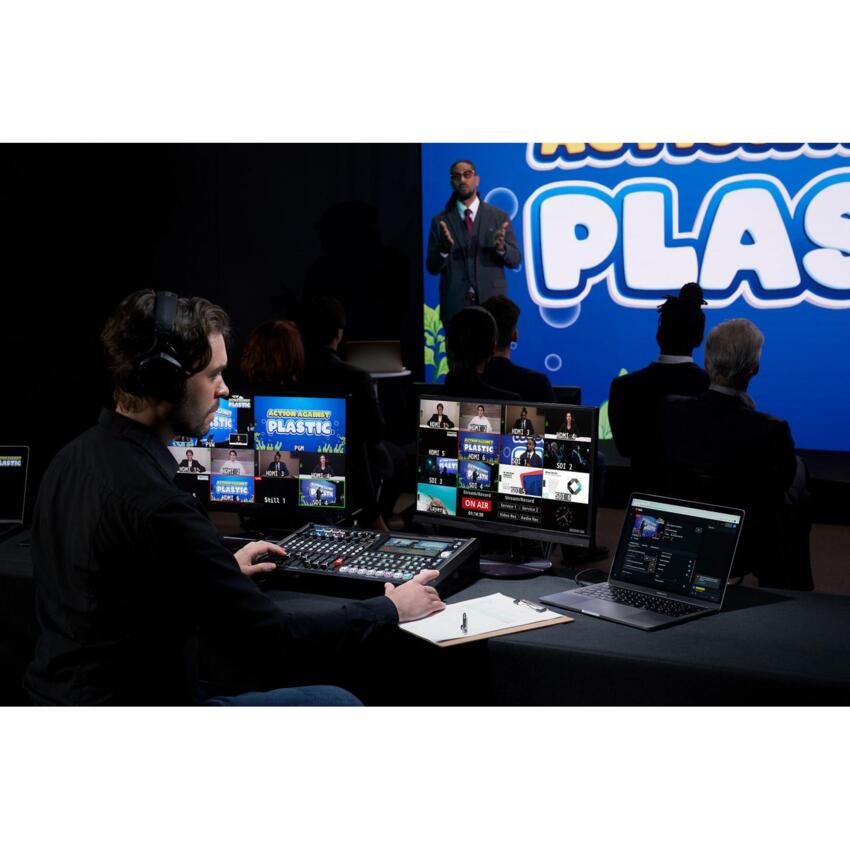 Ulepszaj wydarzenia dzięki wbudowanej obsłudze grafiki i odtwarzania wideo. Wywołuj obrazy podczas przejść między prezenterami, wyświetlaj grafiki w przerwach i używaj PNG do tworzenia dynamicznych dolnych krawędzi. Zintegrowany odtwarzacz wideo pozwala na uruchamianie klipów wideo bezpośrednio z karty SDXC, bez konieczności podłączania zewnętrznego urządzenia odtwarzającego.
