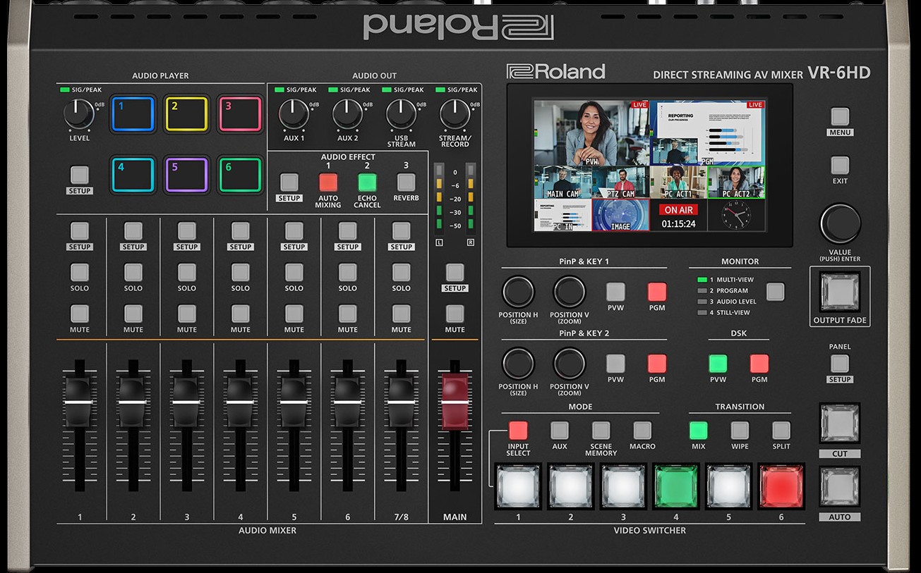 VR-6HD oferuje profesjonalne analogowe połączenia audio z sześcioma zbalansowanymi gniazdami XLR/TRS, wysokiej jakości przedwzmacniaczami mikrofonowymi i zasilaniem fantomowym. Stereofoniczne wejścia RCA są dostępne dla odtwarzaczy audio, instrumentów elektronicznych i innych urządzeń z poziomem liniowym, a wbudowany cyfrowy dźwięk można miksować ze źródeł podłączonych do wejść HDMI i USB. A dzięki wbudowanemu modułowi Bluetooth można łatwo przesyłać dźwięk bezprzewodowo z dowolnego urządzenia mobilnego.