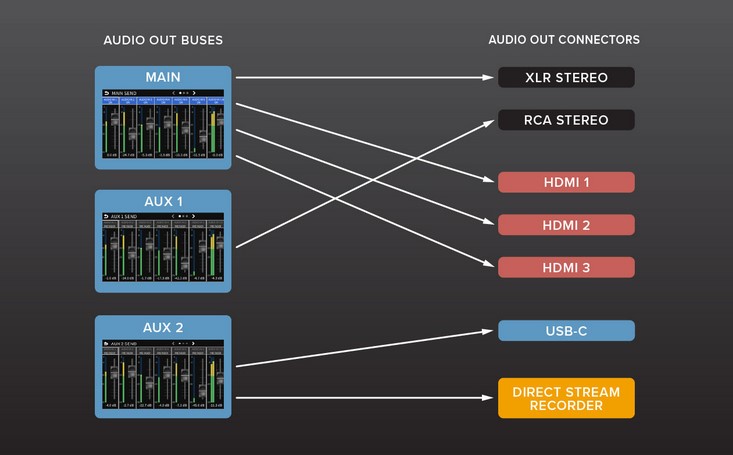 Dwie pomocnicze szyny audio pozwalają skonfigurować unikalne miksy dla różnych zastosowań. Na przykład, można zasilić system monitorowy dla prezenterów, a jednocześnie transmitować na żywo specjalistyczny miks, który jest niezależny od programu na żywo. Wszechstronne kierowanie pozwala na dowolne przypisanie miksu i pomocniczych szyn do dwóch stereofonicznych wyjść XLR, wyjścia stereo RCA, wyjścia USB i wyjścia strumieniowego/nagrywania lub wyjścia HDMI.