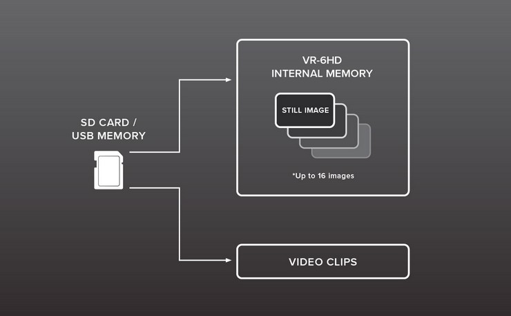 Integrated Playback of Stills and Video Clips Enhance events with onboard support for graphics and video playback. Call up still images during transitions between presenters, display graphics, and use PNGs to create dynamic lower thirds. The integrated video player lets you trigger video clips directly from the SDXC card, with no need to connect an external playback device.