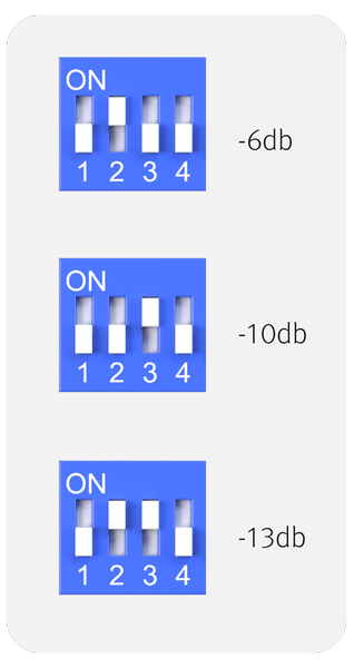 Przy wyrównanej głośności odsłuchu (np.. 83 dB SPL w pozycji monitoringu), potencjometr VOLUME powinien być ustawiony mniej więcej na godzinę pierwszą. Daje to pełny zakres kontroli zarówno głośniejszych, jak i cichszych dźwięków. Warto też zauważyć, że w przypadku tych bardziej czułych aktywnych monitorów czy końcówki mocy, odsłuch może być już całkiem głośny w ustawieniu gałki w 1/3 skali. W takich sytuacjach możemy jednak aktywować jeden z wewnętrznych przełączników, tłumiących sygnał o -6 dB i/lub o -10 dB (DIP 2 & DIP 3). W przypadku włączenia obu tłumików, otrzymujemy poziom zbliżony do około -13 dB.