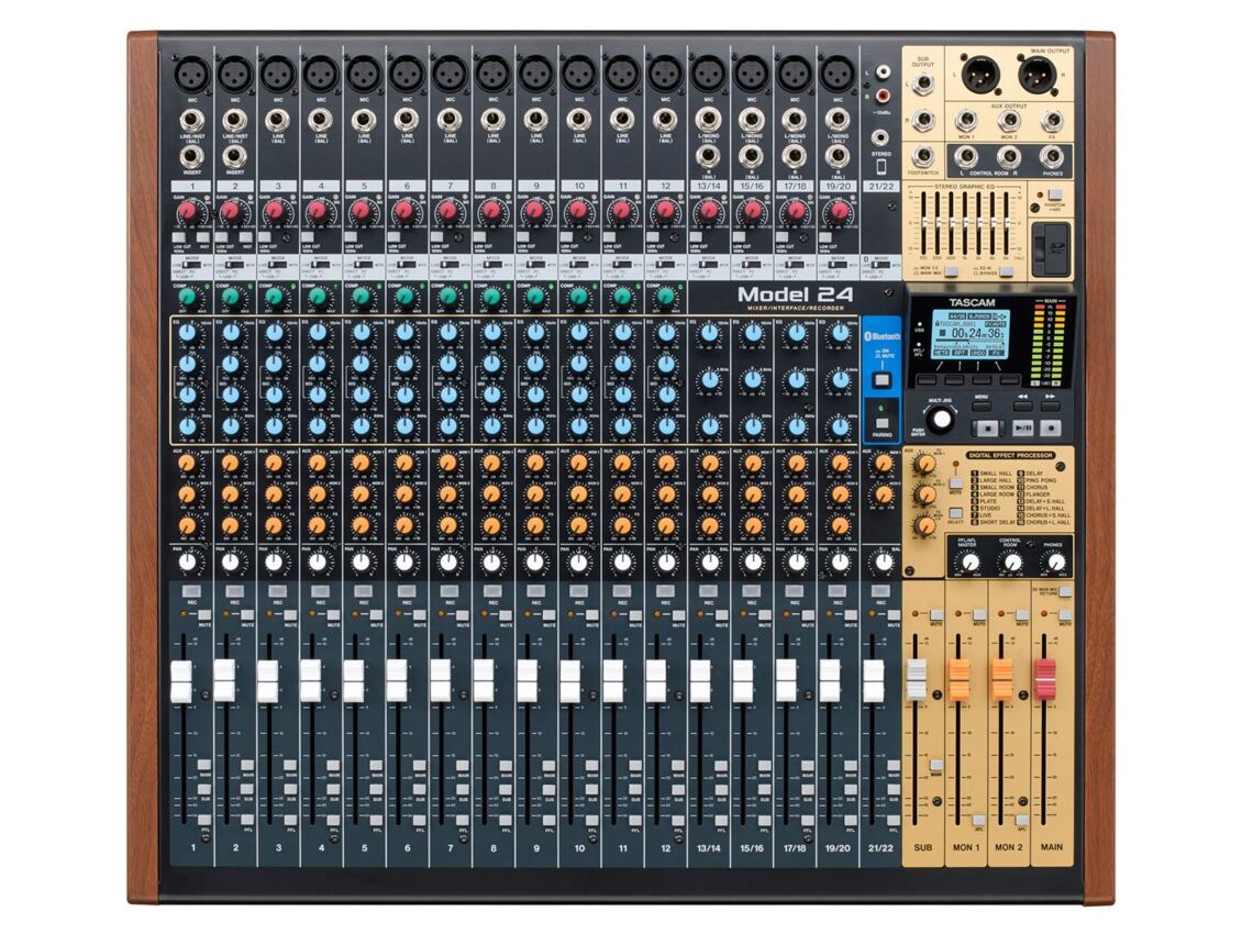 Odrodzony klasyk – Profesjonalna konsola hybrydowa łącząca analogowe ciepło z nowoczesną technologiąTASCAM stale dostarcza wiodące w branży rozwiązania do nagrywania, takie jak szpulowy, 8-ścieżkowy TASCAM 38, cyfrowy 8-ścieżkowy DA-88 oraz legendarna rodzina analogowych kasetowych i cyfrowych rejestratorów wielościeżkowych Portastudio. Teraz, TASCAM powraca do swojego dziedzictwa, łącząc klasyczną linię z najnowszą technologią; Zupełnie nowy, piękny, wielościeżkowy mikser do nagrywania na żywo, Model 24.Niezależnie od tego, czy chodzi o próby, występy na żywo, czy produkcję, Model 24 to idealny, prawdziwy rejestrator wielościeżkowy, mikser i interfejs audio. Potrójna funkcja hybrydowej konsoli do nagrywania ewoluowała, aby idealnie sprostać wymaganiom dzisiejszego przemysłu muzycznego.Odrodzony Klasyk.Prosty, Intuicyjny ProjektWystarczy jedno spojrzenie – Model 24 został opracowany tak, aby był prosty i intuicyjny, aby każdy mógł z niego korzystać. 100-milimetrowe, fizyczne suwaki umożliwiają precyzję podczas regulacji głośności. Dostępny, 7-pasmowy korektor graficzny stereo dla miksu głównego i znane wszystkim pokrętła EQ/Aux, oraz gniazda wejściowe/wyjściowe są na wierzchu dla szybkiego i łatwego dostępu.Rewolucyjna technologia nagrywania TASCAMModel 24 pozwala użytkownikom nagrywać bezpośrednio na kartę SD 24 ścieżki jednocześnie w 24bit/48 kHz i jest zdolny do równoczesnego wklejenia/wycięcia 8 ścieżek w jednym czasie. Dzięki rewolucyjnej technologii nagrywania TASCAM, konsola może również odtwarzać 22 ścieżki na raz, bezpośrednio z karty SD. 16 wysokiej jakości przedwzmacniaczy mikrofonowych TASCAM zagwarantuje uchwycenie nieskazitelnego dźwięku.Elastyczna łącznośćModel 24 jest wyposażony w 22 analogowe wejścia na które składa się 20 wejść symetrycznych (12 mono i 4 stereo) i 1 niesymetryczne wejście stereo. Ponadto, Model 24 pozwala na połączenie z twoim ulubionym programem DAW poprzez złącze USB. Twój smartfon może być połączony poprzez funkcję Bluetooth™ aby przesyłać dźwięk z próby do ćwiczeń indywidualnych lub rozgrzać publikę przed koncertem, odtwarzając utwory zanim ze sceny zabrzmią pierwsze akordy.Trwałość i NiezawodnośćMikser jest lekki – możesz go z łatwością przenosić między studiem, salą prób czy dowolnym innym miejscem gdzie chcesz pracować. Znana niezawodność produktów TASCAM gwarantuje sprawne działanie wszędzie.Model 24: Nagrywaj Miksuj. Połącz. Potrójna funkcjonalność Połączenie dwóch światów, TASCAM Model 24 to w pełni wyposażony, 24-ścieżkowy, cyfrowy rejestrator wielościeżkowy i 24-kanałowy interfejs audio USB ze zintegrowanymi funkcjami miksowania analogowego. Od sceny po studio, Model 24 pomoże ci zmiksować muzykę w jednym, łatwym w obsłudze urządzeniu.NagrywajSercem Model 24 jest legendarny, wielościeżkowy silnik rejestrujący, dostarczający jakość i niezawodność jaką może zagwarantować tylko TASCAM. Model 24 umożliwia odtwarzanie i nagrywanie dowolnej kombinacji 24 ścieżek cyfrowego sygnału audio, a także szybkie i łatwe kopiowanie i nadpisywanie.Nagrywaj każdy swój koncert na żywo, twórz utwory ścieżka po ścieżce lub korzystaj z wcześniej nagranych podkładów aby zrealizować ostateczny występ. Model 24 zaprojektowano tak aby pracował po twojemu, bez opóźnień, bez limitów, bez kompromisów.Połącz.Zarówno w domu, jak i w studio czy w trasie, Model 24 jest idealnym odpowiednikiem twojej cyfrowej stacji roboczej DAW. Dzięki wystarczającej liczbie wejść, aby zarejestrować cały zespół w jednym podejściu, Model 24 zapewnia szybkie i łatwe przesyłanie sygnału do i z komputera, bez konieczności przerywania, przełączania kabli i ponownego ustawiania brzmienia i poziomów. Inspiracje nie będą czekać, a TASCAM cię nie spowolni.Miksuj.Wyposażony w 12 kanałów wejściowych Mono i 4 kanały Mono/Stereo, Model 24 jest wystarczający, aby obsłużyć większość zespołów na scenie, ale wystarczająco kompaktowy, aby przenieść go na koncert. Niskoszumowe przedwzmacniacze o dużym wzmocnieniu, kompresory z jednym pokrętłem (na wybranych kanałach), elastyczne przekierowanie sygnału, poteżny korektor i płynne tłumiki 100mm łączą się, aby zapewnić prawdziwie dynamiczny miks w czasie rzeczywistym. W połączeniu z 7-zakresowym korektorem głównym, dwiema wysyłkami AUX i wbudowanym procesorem efektów tworzą Model 24 prawdziwie potężnym, przenośnym narzędziem do miksowania, gotowym do zabrania na scenę (lub do studio). Brak mylącego menu, zgubionych presetów. Natychmiastowa bezpośrednia kontrola i niesamowita jakość dźwięku analogowego.Przegląd kanałów Zaprojektowany do użytku w trasie i w studio, Model 24 oferuje cztery różne typy kanałów. Pierwsze dwa kanały mają zarówno wejścia XLR jak i wejścia jack z przełączaną czułością (linia/instrument). Pod nimi znajdziemy złącza TRS Insert do łatwego podłączenia kompresora, korektora czy innych efektów. Dalej znajdują się regulatory wzmocnienia przedwzmacniacza (z diodą przeciążenia LED), oraz przełączniki filtra górnoprzepustowego 100-Hz i czułości (linia/instrument).Kolej
