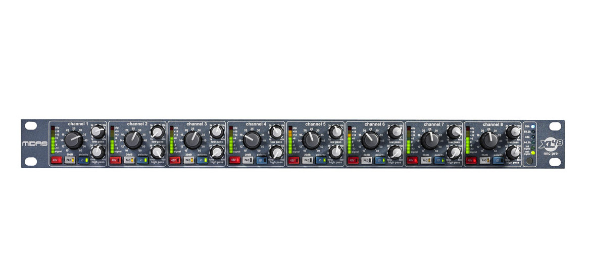 MIDAS XL48 to ośmiokanałowy przedwzmacniacz mikrofonowy DIGI-LOG z konwersją 96 kHz i wyjściami ADAT.