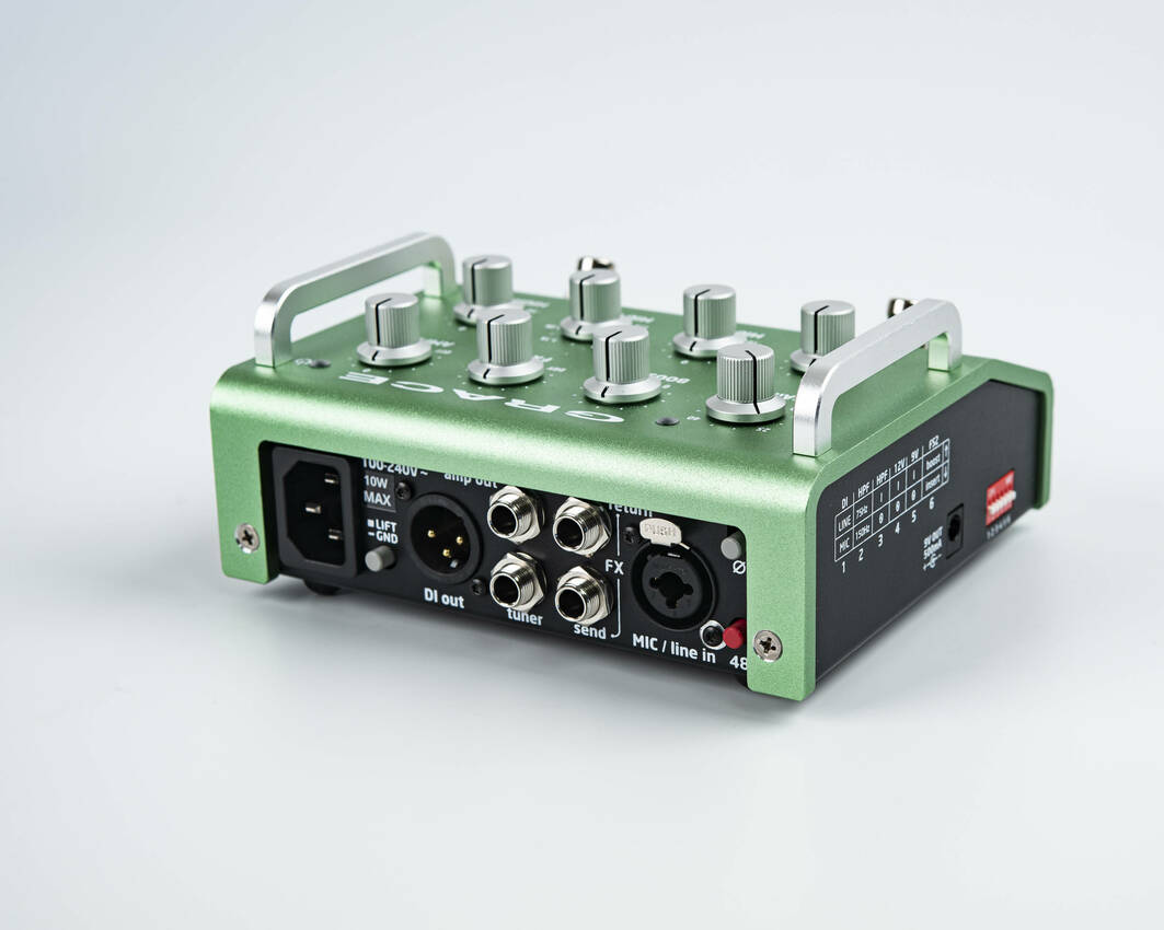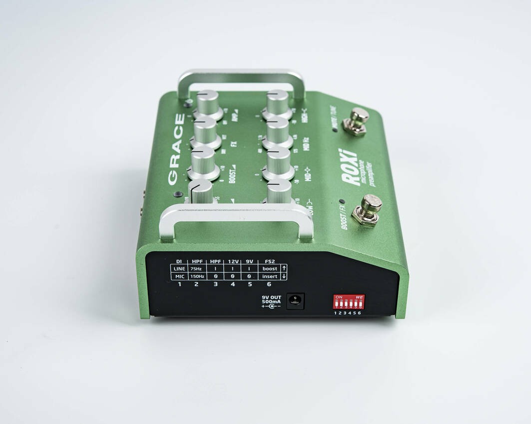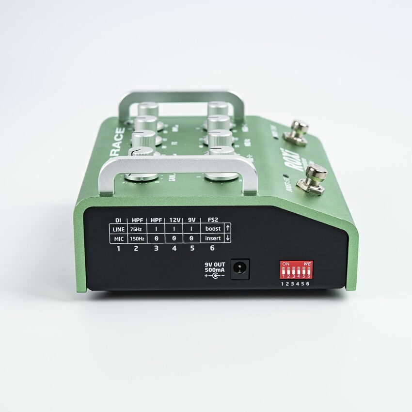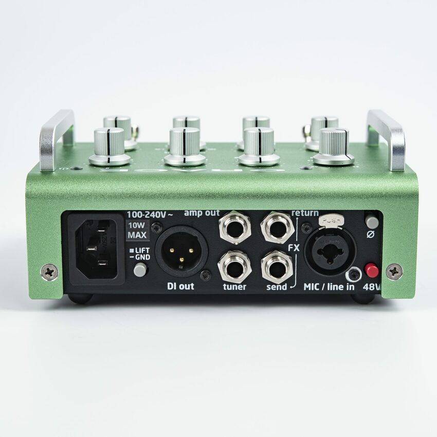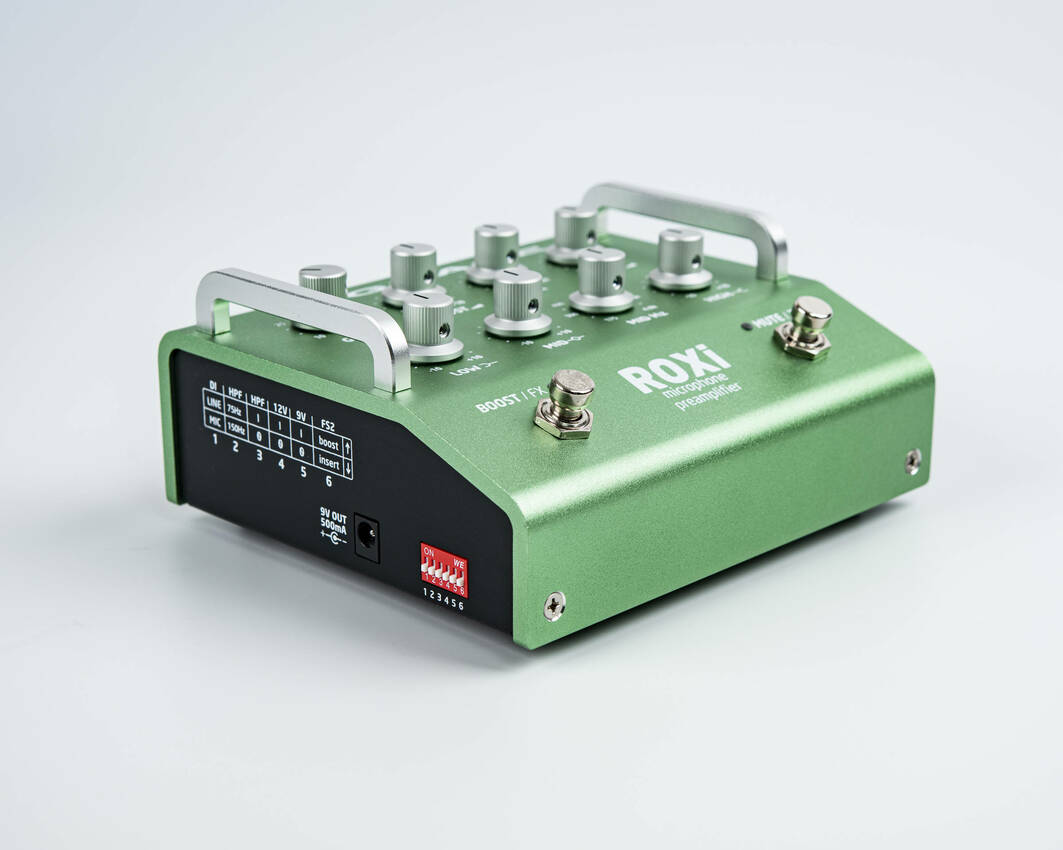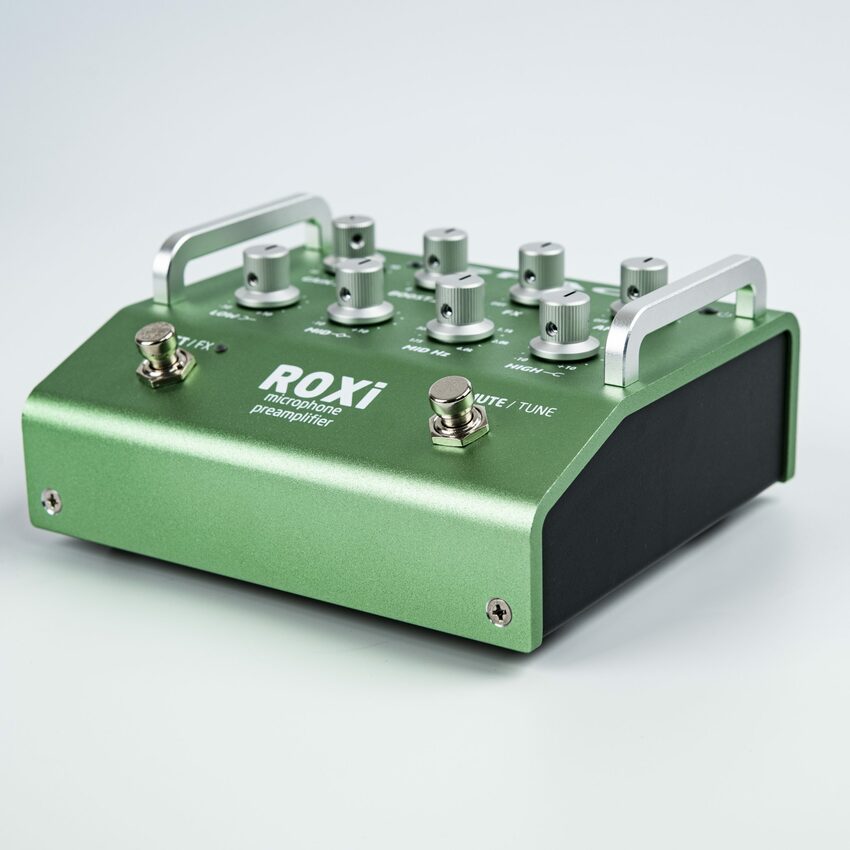 This one is bigger and more kitchen sink-y. This starts with a precision rotary switch gain control, which levels up the audio performance, especially in higher gain ranges (ribbon mics welcome). A 2 position high pass filter gives excellent control of problem bass / rumble areas at 75Hz or 150Hz. A 3-band EQ with sweepable mids rounds out the tone shaping. The FX loop can be defeated by a footswitch and has an onboard blend control to run your effects at 100% and adjust wet / dry amount on the preamp. The input is a combi XLR / 1/4″ jack, so it can run as an instrument preamp like its buddy ALiX .