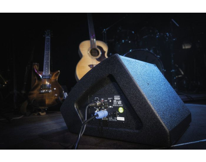 DAP M12 to aktywny monitor podłogowy z 12-calowym głośnikiem niskotonowym i całkowitą mocą 415 W, stworzony specjalnie do wzmacniania dźwięków na scenie. Charakteryzuje się konstrukcją klinową 60° i głośnikiem współosiowym zapewniającym przejrzysty i bezpośredni dźwięk o stałym pokryciu. Potężny wzmacniacz klasy D zapewnia dobrą jakość dźwięku, nawet przy dużej głośności.Wbudowany wzmacniacz M12 posiada złącze wejściowe XLR/Jack, liniowe złącze wyjściowe XLR oraz złącze wejściowe i wyjściowe PowerCON. Jest on wyposażony w regulację głośności, selektor ustawień wstępnych EQ, przełącznik uziemienia i bezpiecznik AC do regulacji dźwięku i poziomu wyjściowego.Zintegrowane uchwyty chronią wbudowany wzmacniacz i złącza przed uszkodzeniem i sprawiają, że jest to bardzo łatwy w obsłudze monitor podłogowy, nawet w najtrudniejszych warunkach scenicznych.