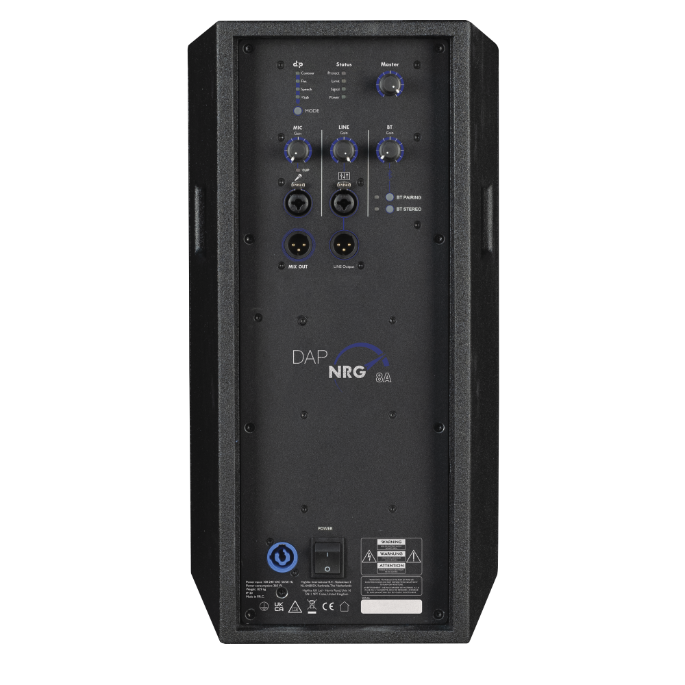 DAP NRG-8A to aktywny głośnik pełnozakresowy o mocy szczytowej 360 W (180 W mocy ciągłej RMS). Wykorzystuje on 8-calowy głośnik niskotonowy i 1-calowy przetwornik kompresyjny oraz posiada wewnętrzny procesor DSP z 4 przydatnymi trybami: Contour, Flat, Speech i +Sub, które stosują odpowiednio krzywą głośności, krzywą płaską, krzywą górnoprzepustową lub górnoprzepustową ze zoptymalizowaną krzywą częstotliwości i fazy specjalnie dla gamy subwooferów NRG. Przetwornik kompresyjny jest połączony z obrotową tubą o kierunkowości 90°x 60°. Wewnętrzny wzmacniacz klasy D ma zasilacz impulsowy, aby utrzymać niską wagę i wysoki poziom wydajności. Wewnętrzny procesor DSP zawiera zwrotnicę dla głośnika niskotonowego i kompresyjnego, 2-pasmowy limiter, zabezpieczenie przeciwzwarciowe i termiczne.Oprócz dedykowanych gniazd combo XLR dla sygnałów mikrofonowych i liniowych, NRG-8A posiada zintegrowany odbiornik Bluetooth 5.0 do odtwarzania muzyki z telefonu komórkowego, laptopa lub innego odtwarzacza multimedialnego Bluetooth. Odbiornik Bluetooth posiada funkcję True Wireless Stereo (TWS) i można go skonfigurować tak, aby cieszyć się dźwiękiem stereo podczas korzystania z pary pełnozakresowych głośników NRG. Wyjście liniowe jest zapętlone i dostępne jest dodatkowe wyjście „Mix out” ze wszystkimi sygnałami dostępnymi do napędzania drugiego urządzenia lub subwoofera, najlepiej z serii NRG. Oddzielne regulatory wzmocnienia ułatwiają regulację poziomu różnych sygnałów wejściowych, a główny regulator ustawia ogólną głośność.Wytrzymała, lekka obudowa ze sklejki ma podwójny kąt nachylenia (0° i 0°).umożliwiając skierowanie obudowy w dół podczas montażu na słupie. Aby w pełni wykorzystać możliwości NRG-8A, zalecamy dodanie subwoofera z serii NRG.SpecyfikacjeWyjścia