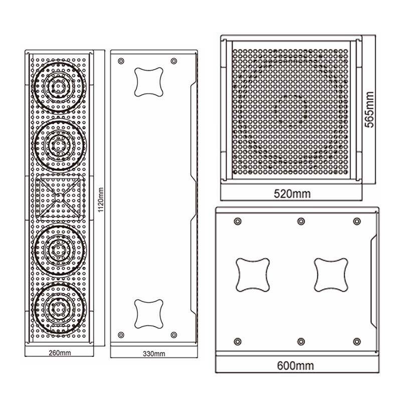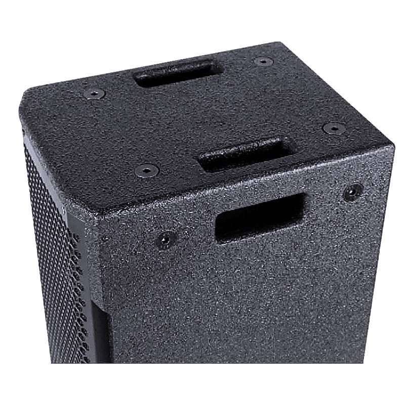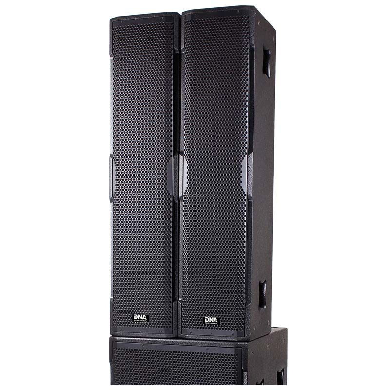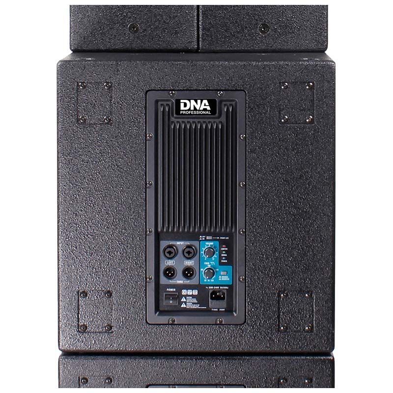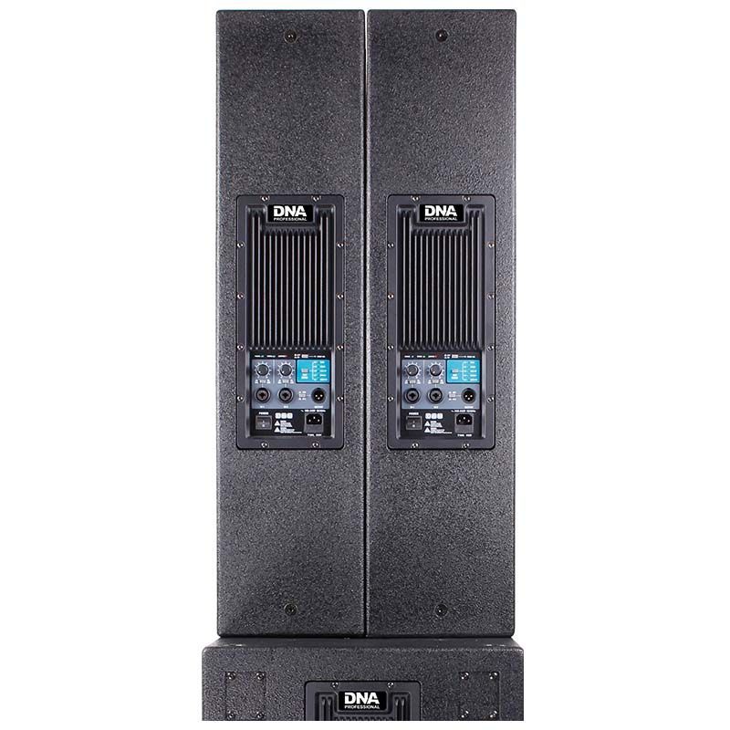 Komponenty każdej kolumny wysokotonowej zamknięte zostały w podłużnej, sześciennej obudowie wykonanej z 15-milimetrowej sklejki z topoli pomalowanej na czarno wodoodporną farbą. W środku znajdują się cztery 8-calowe głośniki oraz 4,5-calowy tytanowy driver, które w sumie mają moc RMS wynoszącą 1500W i tworzą falę akustyczną o ciśnieniu szczytowym nawet 138 dB! Z tyłu umiejscowiony został panel z przełącznikiem i gniazdem zasilania IEC, dwoma wejściami typu combo XLR/Jack i obrotowymi potencjometrami oraz wyjście XLR. Każdy woofer posiada również system diod sygnalizujących pracę jednostki oraz wbudowany procesor DSP z pięcioma presetami kształtującymi sygnał wychodzący. Dzięki niemu oraz zastosowaniu bardzo wydajnego wzmacniacza klasy D możemy uzyskać dźwięk o szerokim zakresie głośności i zróżnicowanym zabarwieniu.